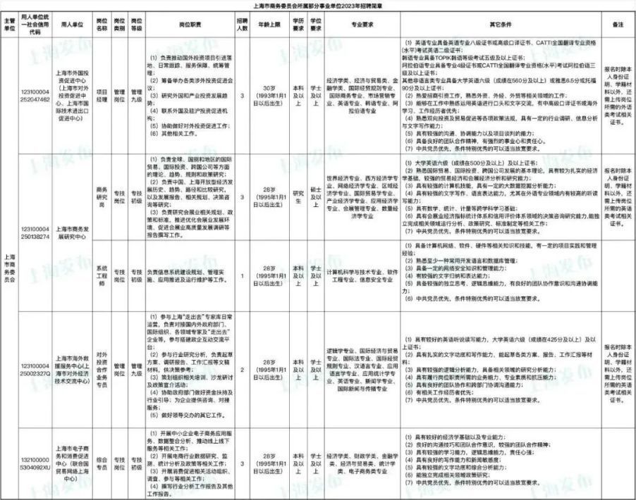 (二)岗位职责、任职条件等详见《上海市商务委员会所属部分事业单位2023年招聘简章》(以下简称《招聘简章》),需具备招聘单位规定的岗位聘用要求、工作能力;