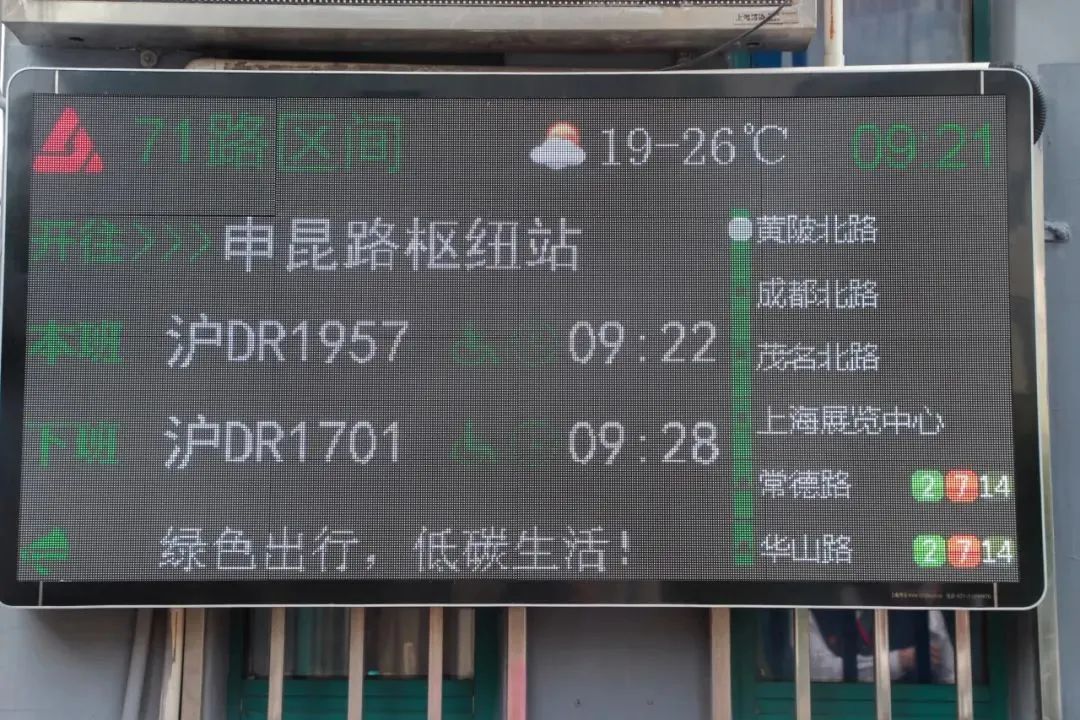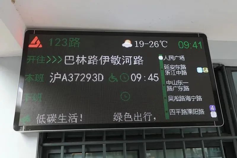 在公交车辆到站预报准确率保持在95%以上,推出乘车舒适度预报等服务、无障碍车辆信息预报举措后,久事公交进一步拓展丰富便利市民出行的数字化应用场景,在电子信息屏屏幕左侧滚动显示出沿途公交停靠站以及换乘地铁信息,赢得了市民乘客和外地游客的好评。目前,久事公交已陆续完成225块新型发车屏的换装,此外,239块中途站LED屏、4000多块中途站墨水屏发布周边300米范围内轨交换乘信息息。至2025年,久事公交计划完成所有公交线路终点站发车屏的升级改造。