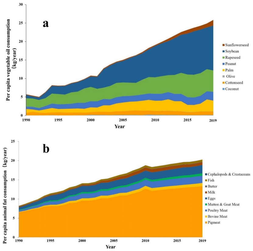 中国1990年~2019年植物油( a )和动物脂肪( b )消费变化趋势