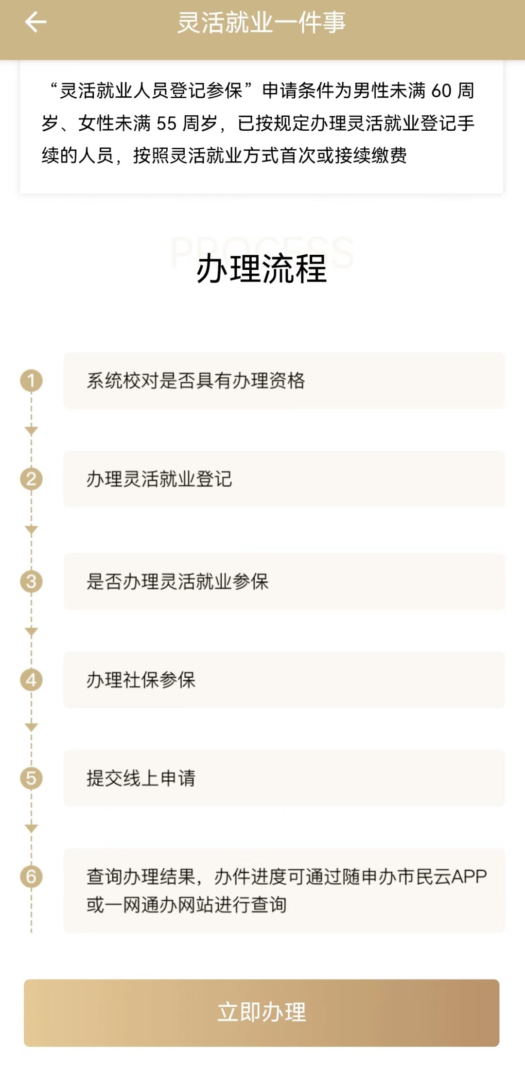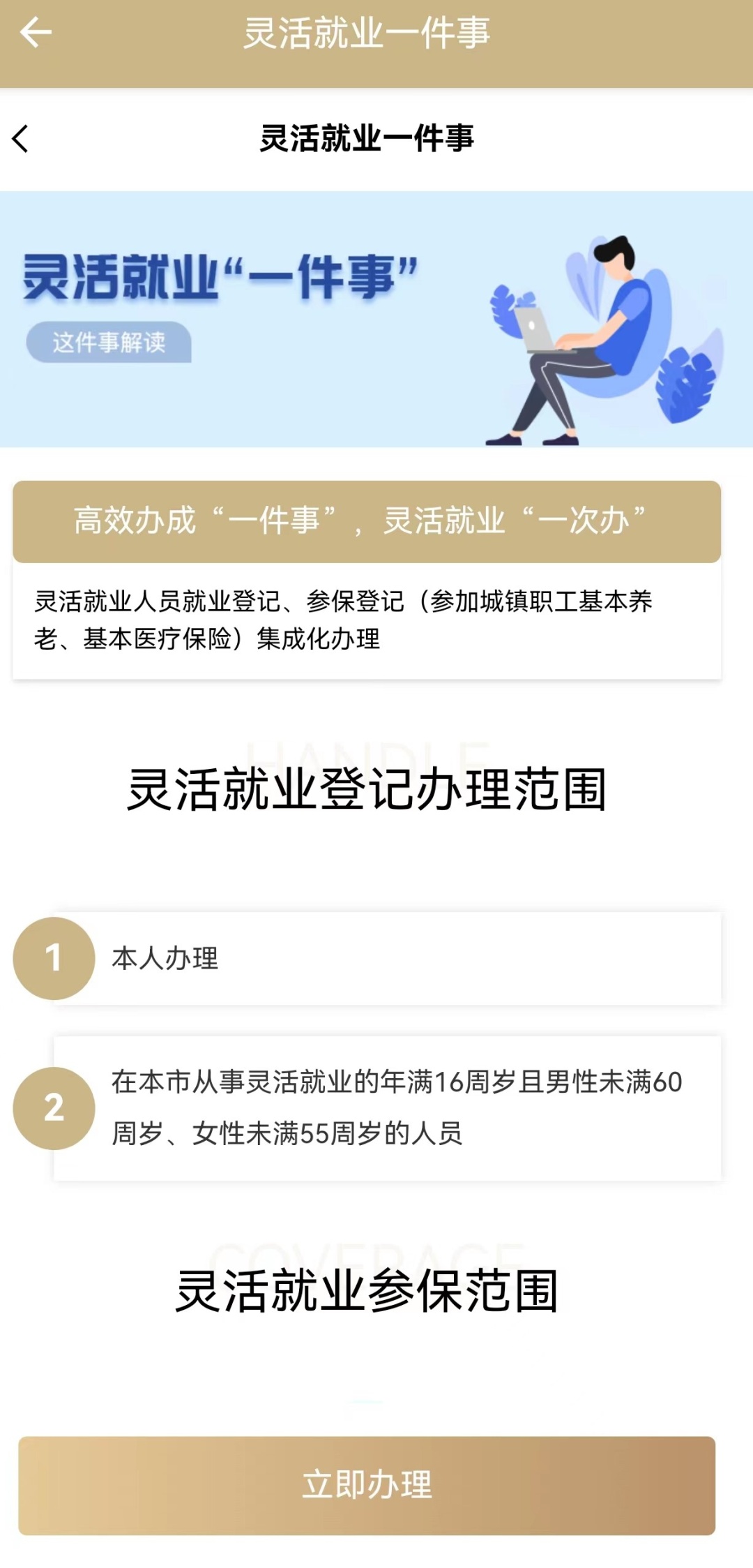 第一步:登录“随申办”APP,搜索“灵活就业一件事”进入办理功能,阅读“灵活就业登记办理范围”“灵活就业参保范围”和“办理流程”后,点击下方【立即办理】,即可进入办理页面: