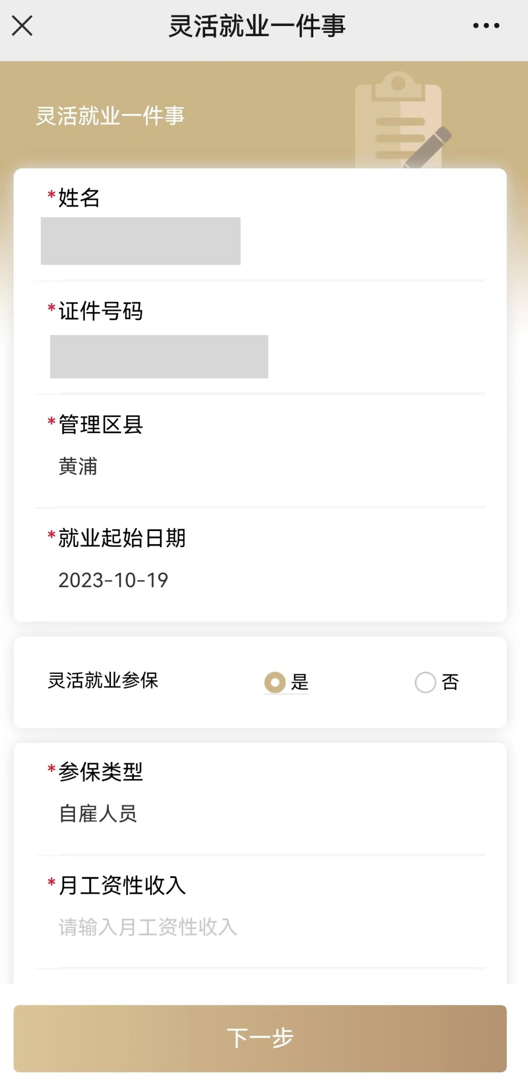 第二步:核对【姓名】【身份证号码】【就业起始日期】信息后,根据本人实际情况,选择对应【管理区县】,并在【灵活就业参保】选项内选择【是】后,系统将自动增加参保信息录入界面。