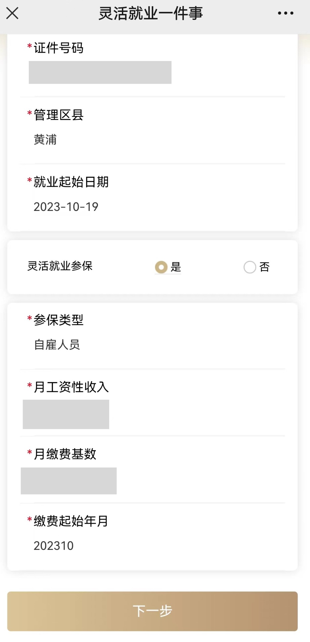 第三步:核对【参保类型】【缴费起始年月】信息后,录入【月工资性收入】,系统将根据录入金额,自动确定并显示【缴费基数】。完成填报后点击【下一步】。