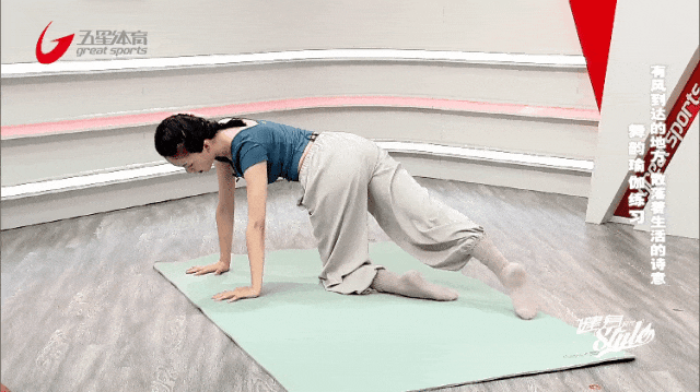 动作要点:双手支撑收腿,直接转向髋关节坐下来,右腿膝盖要往上拎,右脚脚尖沿着地板转向右侧。手脚在划半圆的过程中,手是提手肘的,放在身体前侧,屈肘向前去伸。