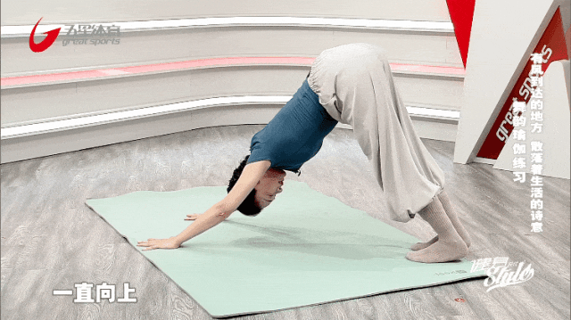 动作要点:开始动作是雷电坐姿,从雷电坐姿过渡到下旋姿势。首先手臂向前伸出去,要将手肘先往上提,到手腕,最后到手指尖,一节一节延伸出去。双手铺开、张大压住地板。臀部离开脚跟,勾脚,同时重心向后压,伸直双腿来到下犬姿势。