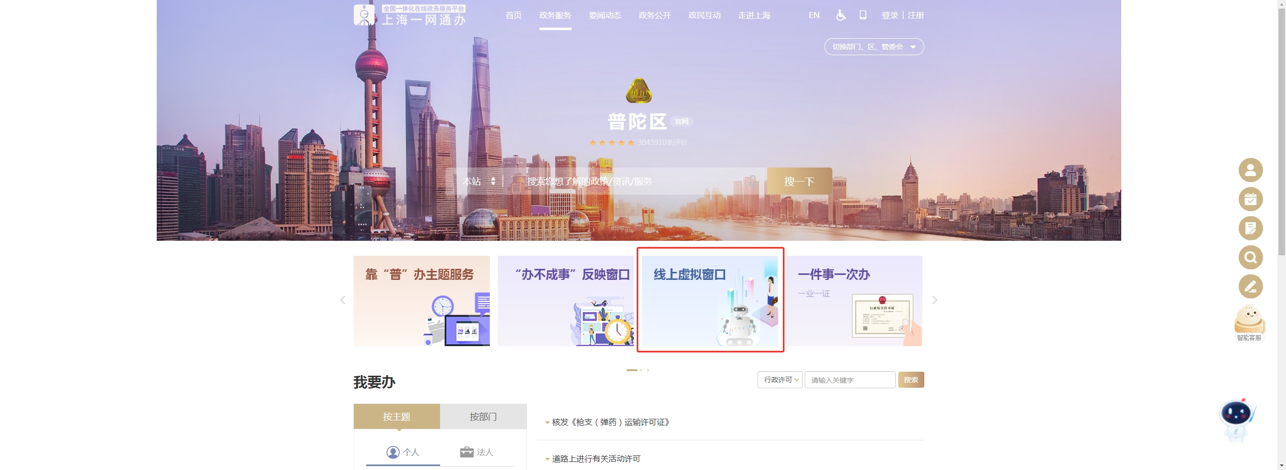 普陀打造“政务远程虚拟窗口”,办事人只需登录“一网通办”一体化在线服务平台,点选普陀区“线上虚拟综窗平台”,便可足不出户通过远程屏幕共享、音视频智能交互等方式,实现与区政务服务中心(以及区级部门政务服务中心)窗口工作人员“零距离”沟通,或接受窗口工作人员远程帮办代办服务,从而实现通用业务的快捷办理,享受与线下实体政务大厅同质的办理体验。此外,通过“一网通办”一体化在线服务平台的“智慧好办”“一件事”等模块,办事人可通过实时在线交流及人工智能自动生成等方式,直接完成信息填报、材料制作,进行网上申报。事项咨询、办理等原本需要在线下综合窗口才能完成的事情,如今通过“屏对屏”实现了“面对面”交流,通过键盘鼠标完成了“手把手”帮办,真正为企业和群众带来“沟通无障碍、服务零距离、全程零跑动”的办事体验,从最大程度上推动了“数据多跑路,群众少跑腿”。