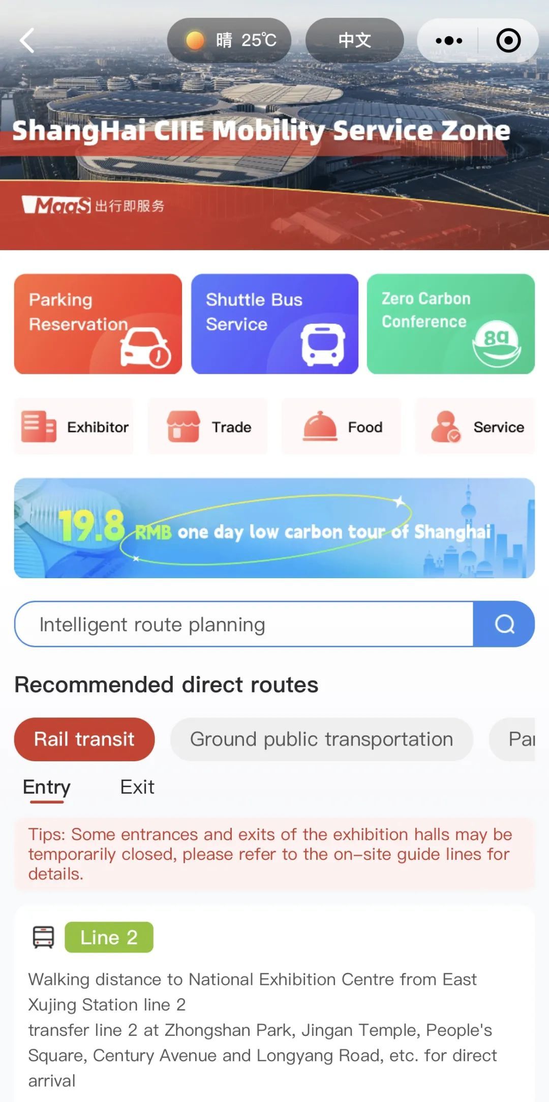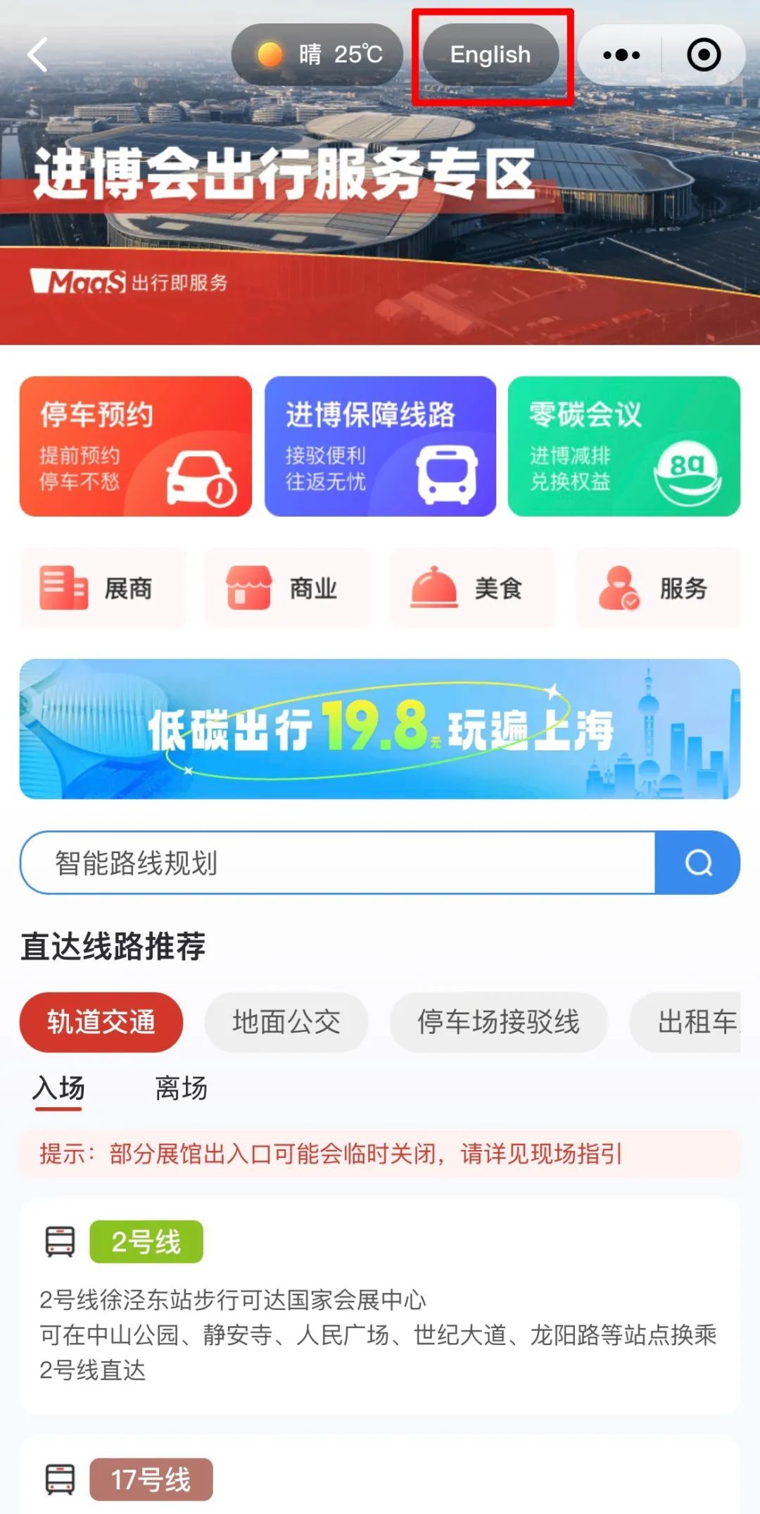 下面就以“随申行”微信小程序为例,展示一下如何使用英文版“进博会出行服务专区”。