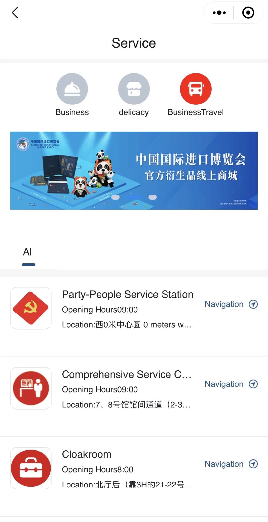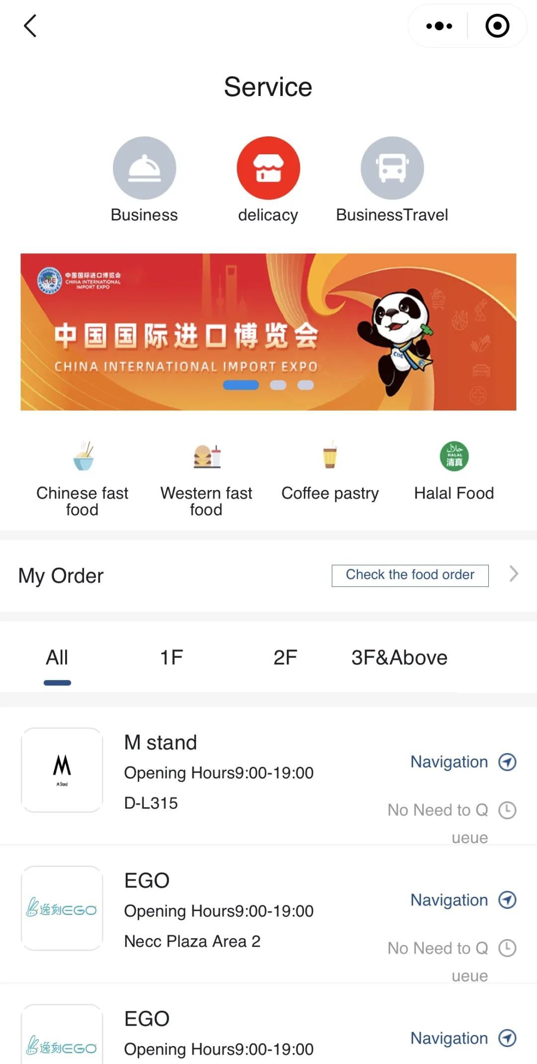 除此之外,场馆内部的商业、美食等信息也都一一定位展示,方便参会的国际友人快速找到自己需要的服务。