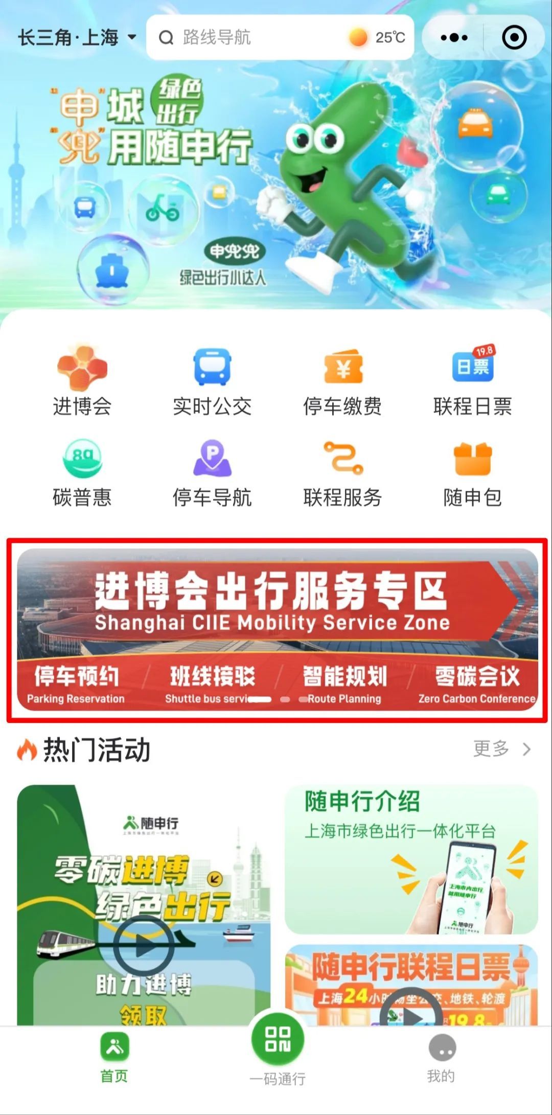 1、微信搜索并打开“随申行”小程序,点击“进博会出行服务专区”↓