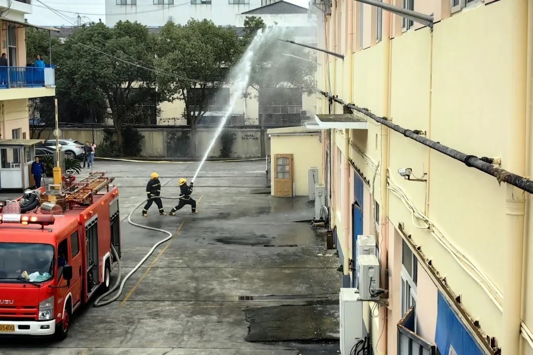 同时,利用高压水枪压制火势