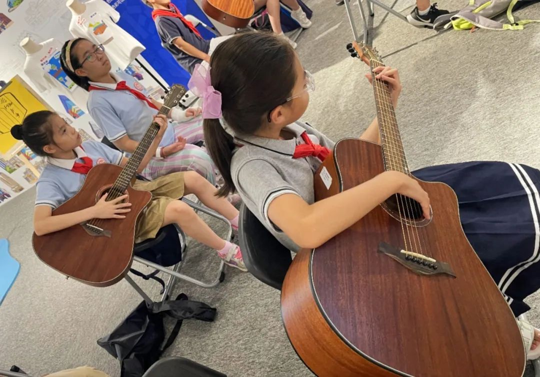 在《民谣吉他》《音乐手碟》《古诗吟诵》《声乐入门》《民乐启蒙》的课程学习中,孩子们踏入音乐的殿堂,体验旋律的律动。孩子们手握民谣吉他,弹唱自己喜欢的歌曲;尝试音乐手碟,制作出音乐节目或混音;学习古诗吟唱,感受诗词的韵律和魅力;体会声音游戏,和同学们一起进行有趣的声音互动;了解民乐鉴赏,欣赏不同种类和风格的民族乐器和音乐。