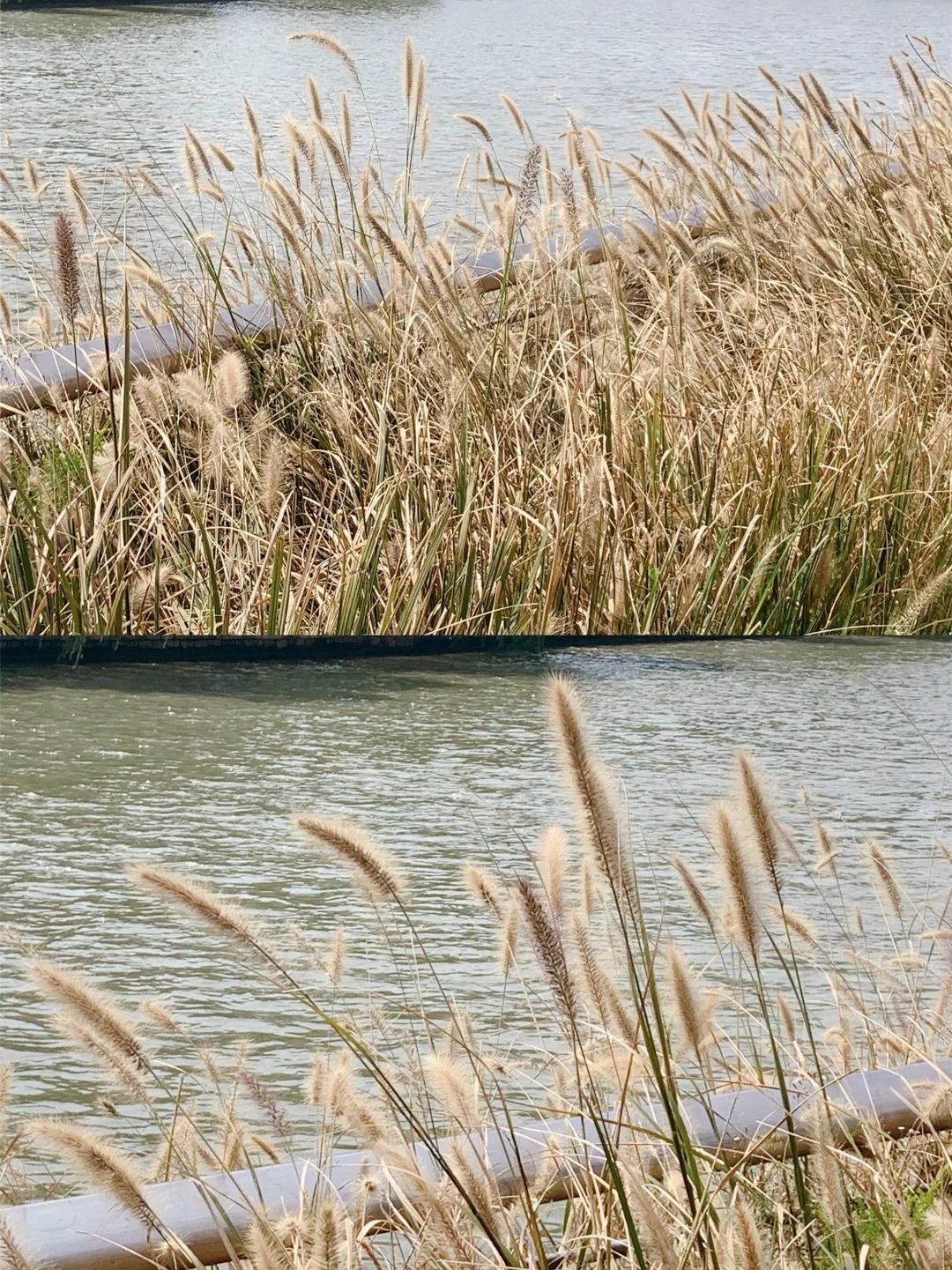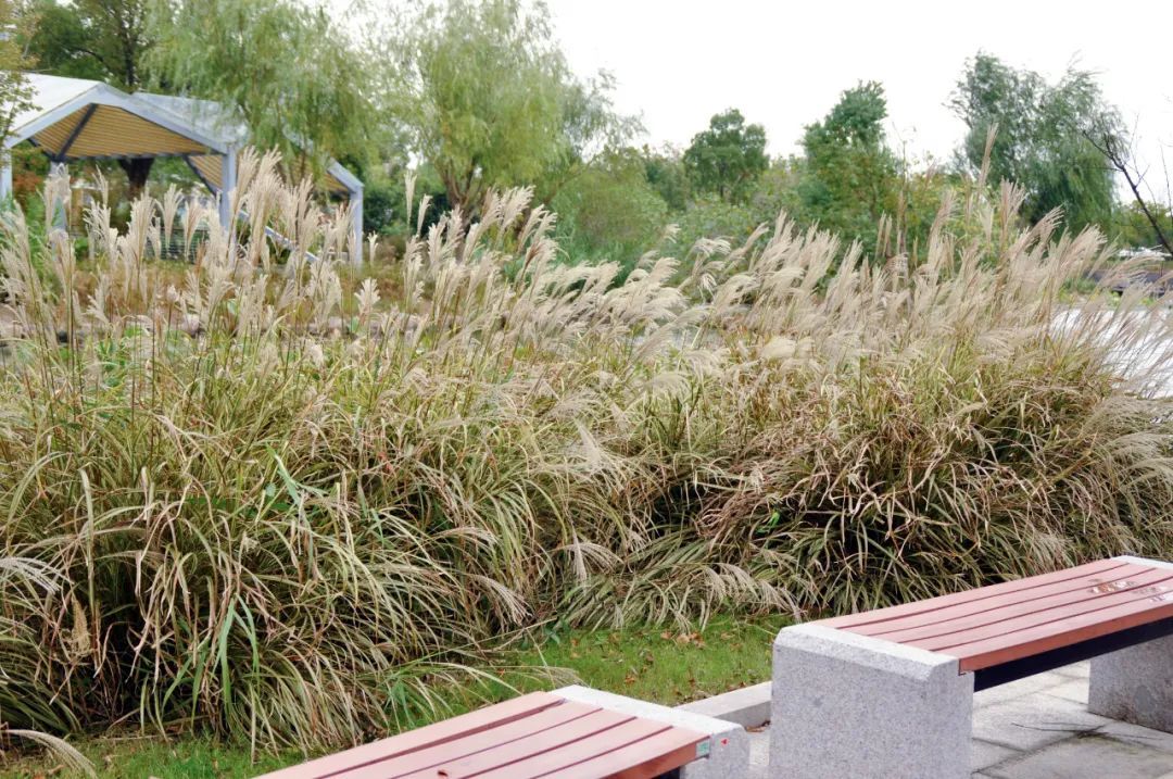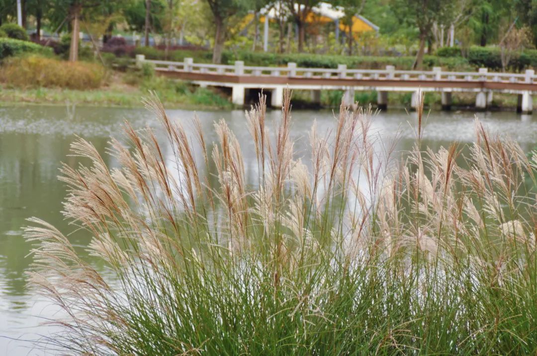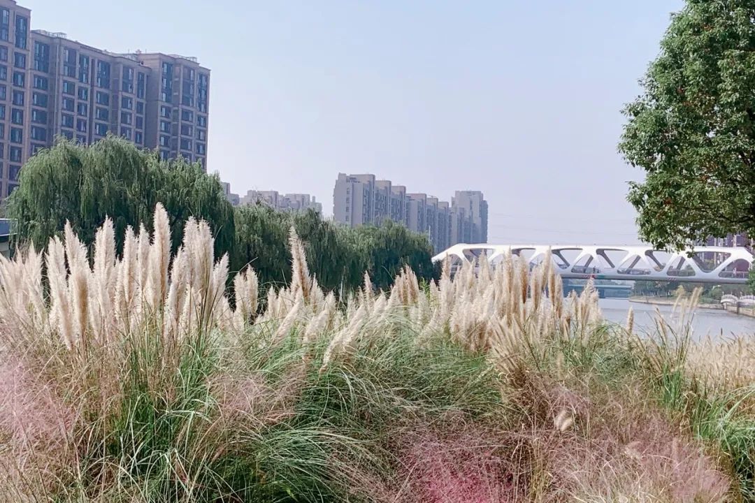 秋冬季节交替之际,青浦环城水系各公园、各骨干河道滨江绿道,种植了芒草、蒲苇、狼尾草等多种观赏草,搭配绿树、碧水,构成一幅幅清新而绚烂的植物油画……