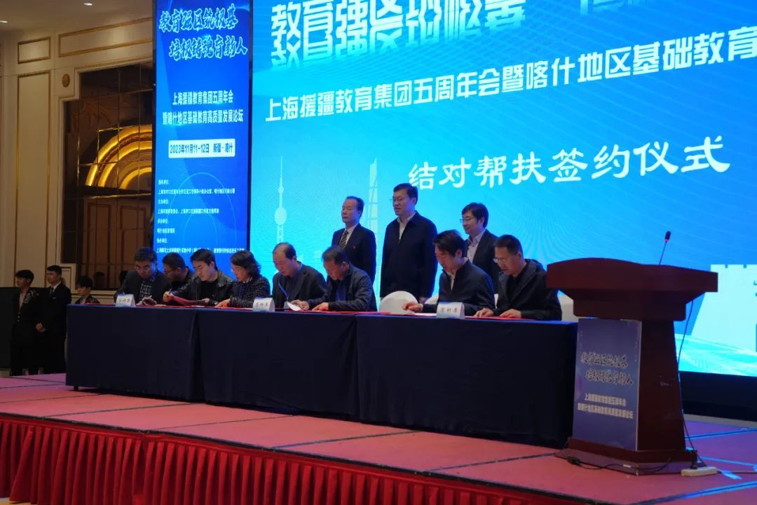 会上,上海浦东、静安、闵行、宝山四区与对口喀什四县及援疆核心学校喀什六中举行了结对帮扶签约仪式,喀什六中与上海宝山中学结对,浦东新区新时代小学等10所上海四区学校与莎车一小(小学)等10所喀什四县学校结对帮扶。浦东新区教育局总督学丁黎忠代表上海援建地区表示,将在上海市教委和上海援疆教育集团的指导下,进一步探索符合当地基础教育高质量发展的新机制,共谋喀什地区基础教育发展新格局。