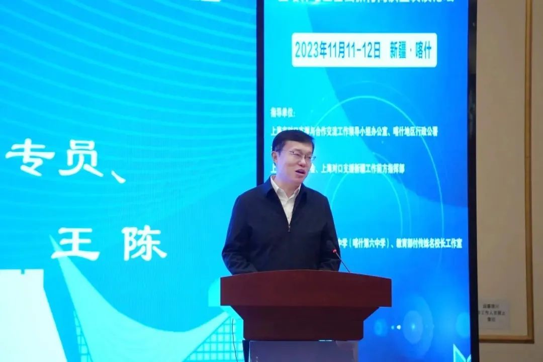 近日,上海援疆教育集团五周年会暨喀什地区基础教育高质量发展论坛在喀什市举行。上海四区与对口喀什四县及援疆核心学校喀什六中结对帮扶,上海援疆教育集团师资培训中心正式揭牌,推动喀什地区教育教学水平全面提升。上海市教委副主任杨振峰,上海援疆教育集团理事长、喀什地区行署副专员、上海援疆前方指挥部副总指挥王陈,上海援疆教育集团理事长、上海师范大学副校长蒋明军出席活动并讲话。