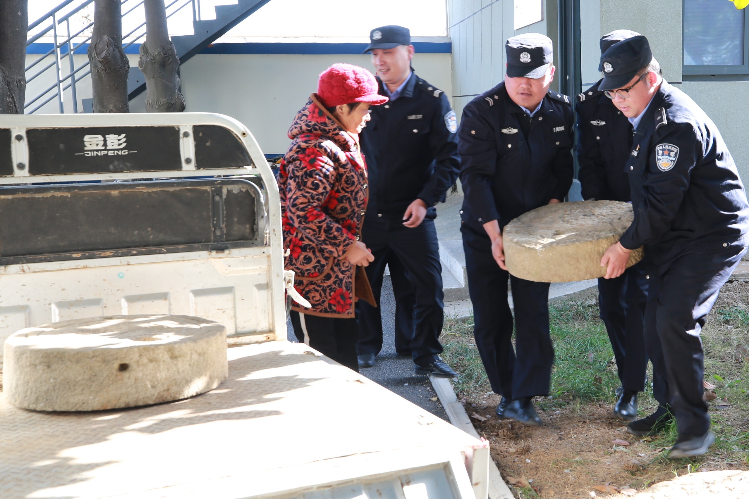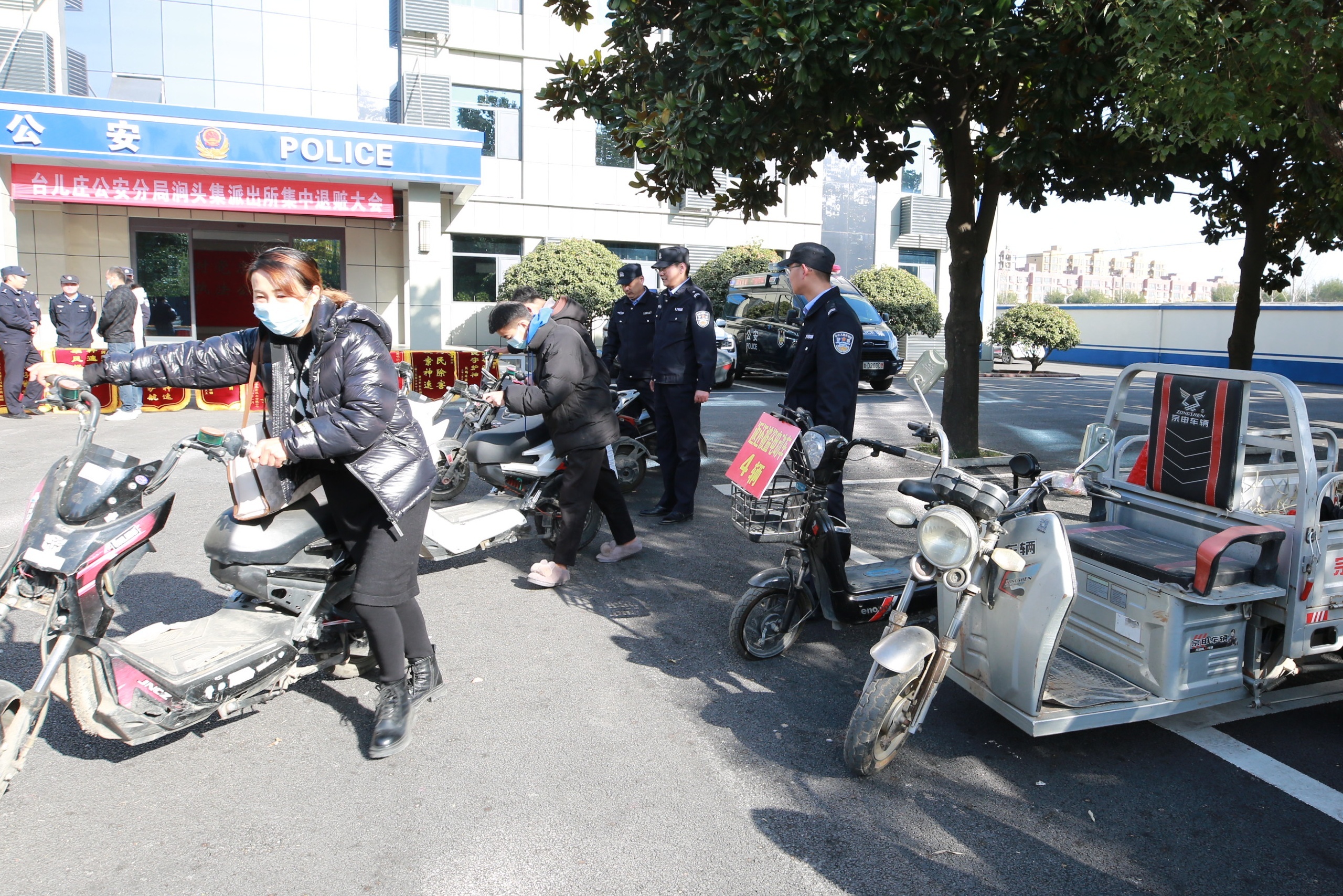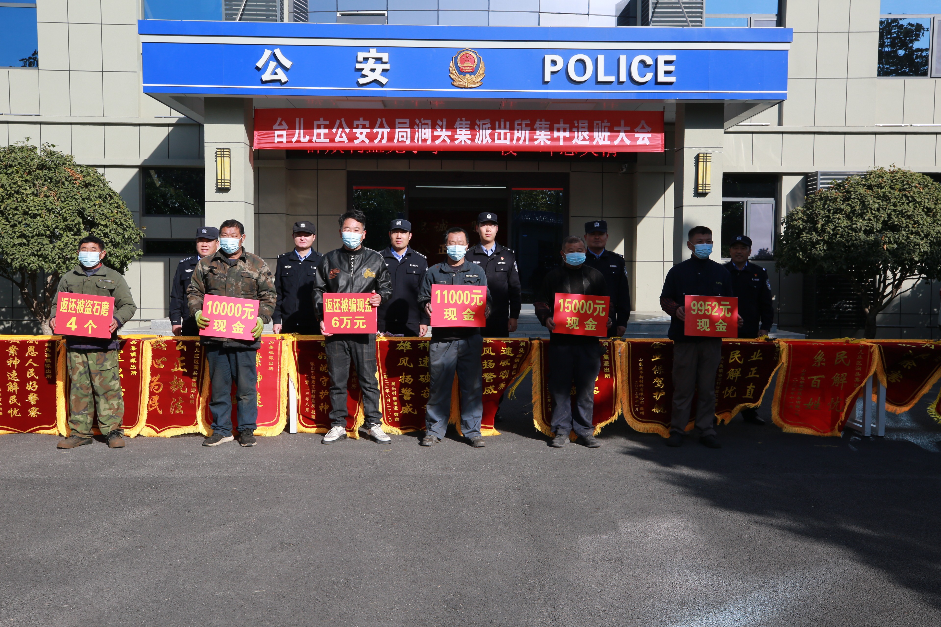 11月24日,枣庄市公安局台儿庄分局涧头集镇派出所召开集中退赃大会,将10余万元被骗盗现金及价值数万元的电动车、电瓶、钢材、石磨等退还失主,得到群众的赞誉并自发送来锦旗20 余面。(大众报业·大众日报客户端记者 张环泽 报道)