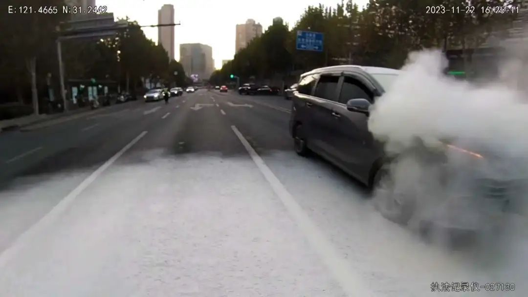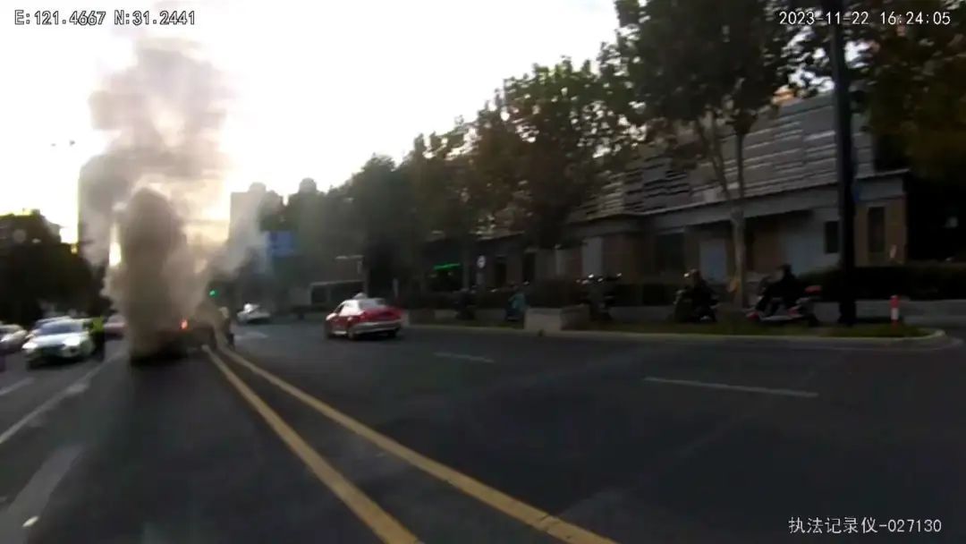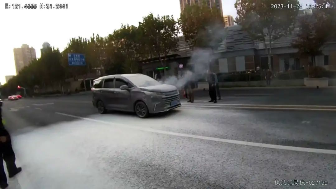 前天(11月22日)下午,在西藏北路曲阜路突发惊险一幕,一辆商务车引擎盖突然冒烟,随后浓烟滚滚。在附近开展交通整治的民警发现这一情况后,随即展开紧急处置。