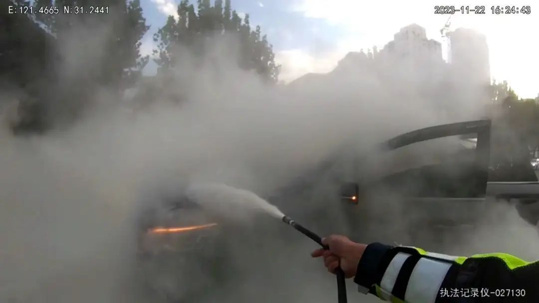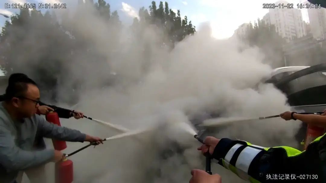 民警发现,此时车辆已有着火迹象,随即至附近沿街面商铺内拿取灭火器,上前灭火。多位热心市民加入到灭火行动中。