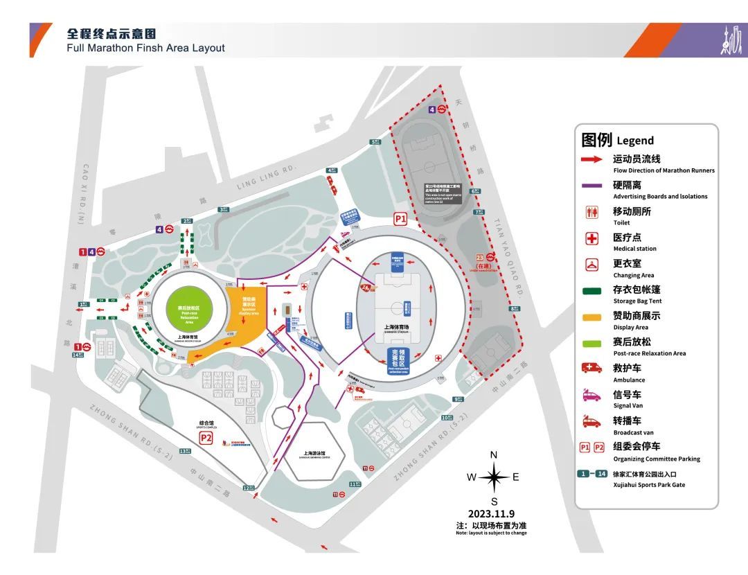 全程马拉松项目终点设在徐家汇体育公园庆典广场,跑者由徐家汇体育公园12号门进入,经久事体育大厦和体育场7号扶梯后抵达终点,冲线绕行火炬台后由体育场4号通道进入场内领取完赛奖牌和完赛包等物资、后由上海体育场1号通道离场后沿内部道路向西前行,经过赞助商展示区后,根据取衣帐篷编号的指引,至对应的取衣帐篷领取自己的存衣包。