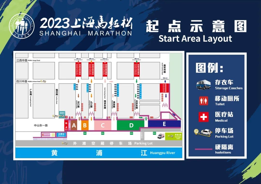 本次赛事A、B、C、D、E区运动员分别从汉口路、九江路、滇池路、中山东一路、南苏州路进入集结区。除E区不提供健身跑跑者存衣服务,其他各区均就近设置若干存衣车。