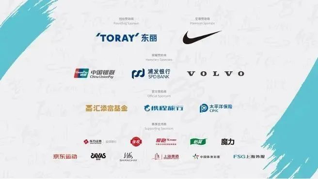 感谢创始赞助商——东丽株式会社及东丽(中国)投资有限公司;至尊赞助商——耐克体育(中国)有限公司;荣耀赞助商——中国银联股份有限公司、浦发银行、沃尔沃汽车;官方赞助商——汇添富基金管理股份有限公司、携程旅行、中国太平洋保险;赛事支持商——东方证券承销保荐有限公司、佳农食品控股(集团)股份有限公司、中国石化销售股份有限公司、华润怡宝饮料(中国)有限公司、京东运动、明治 (中国) 投资有限公司、豫园股份旗下上海表业有限公司、上海贵酒股份有限公司、上海市体育彩票管理中心、上海外服(集团)有限公司的大力支持。