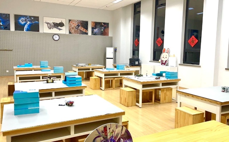 走进科创教育教室,随处可见宇航员模型、卫星模型、探测器拼图等航天元素,墙面也点缀装饰着各类科创实践工具。目前,航天科创教育基地开放3间科创教育专用教室,教学大楼展厅与操场也纳入科创活动场所。同时,配套了一批专业的课程教学设施设备,为学生打造全方位沉浸式体验。