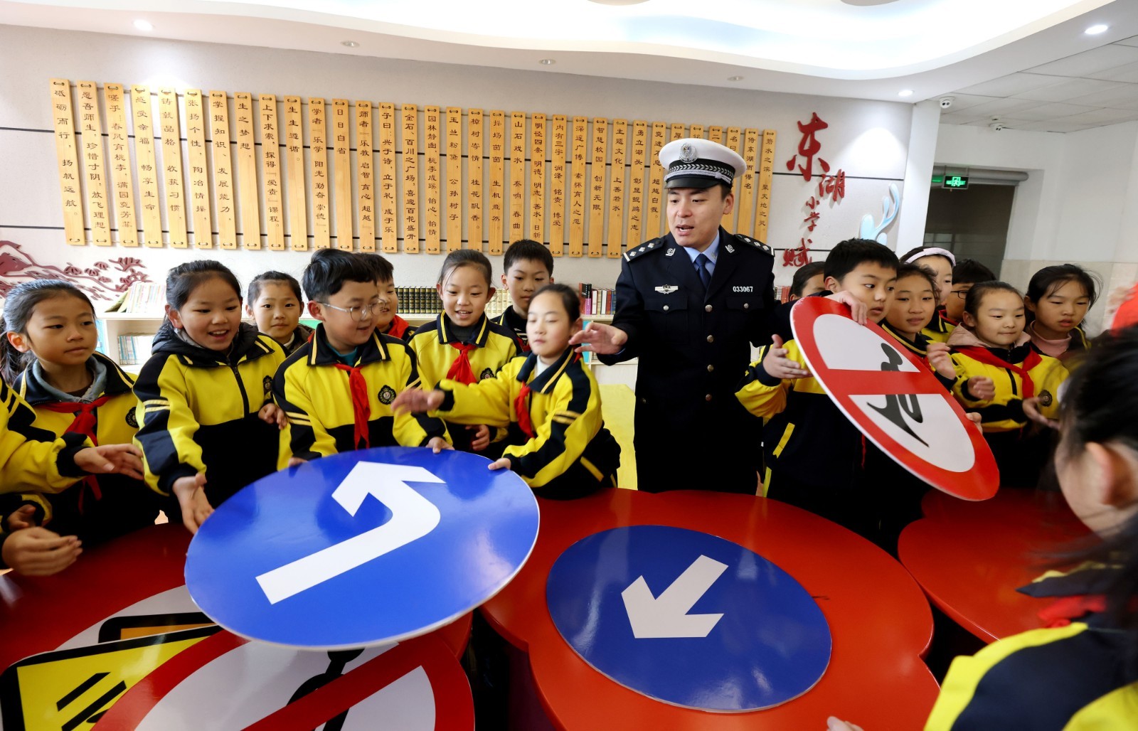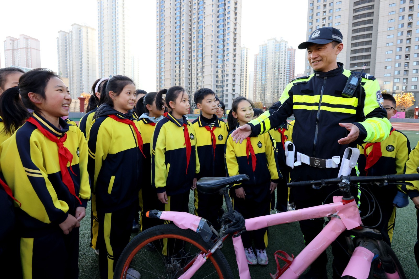 11月30日,枣庄市公安局市中分局交通警察大队民警在当地东湖小学与学生一起互动传授交通安全知识、做交通安全趣味游戏,铁骑队员向学生宣传未满12周岁儿童禁止骑自行车上路的交通规定。