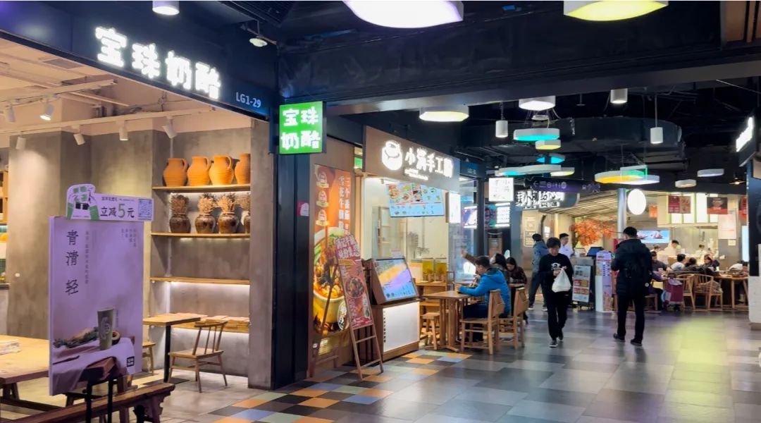 而B2层主要是美食广场,荟萃了各式各类餐饮店铺,从奶茶、咖啡,到轻食、面馆,是聚餐的好地方。