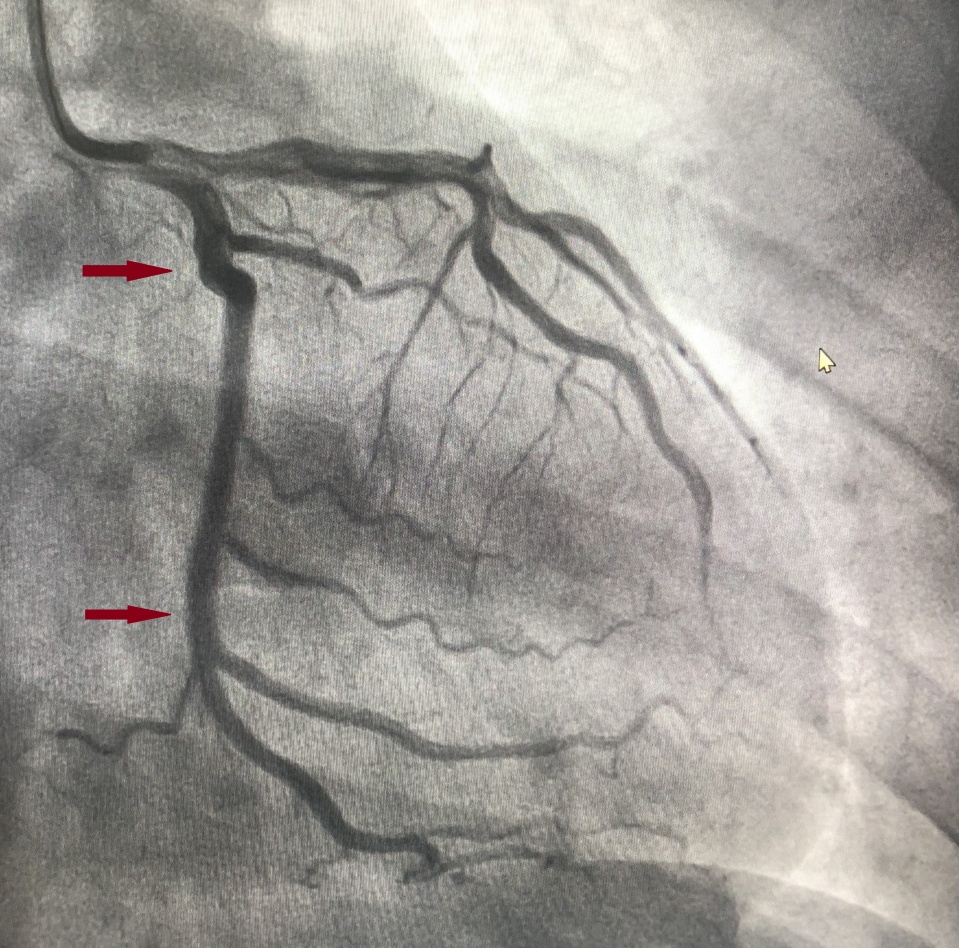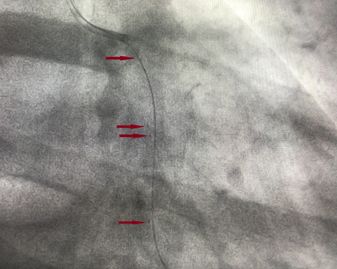 红色箭头处可见BRS两侧的铂金Marker;串联(头尾相连但无重叠)植入2枚支架