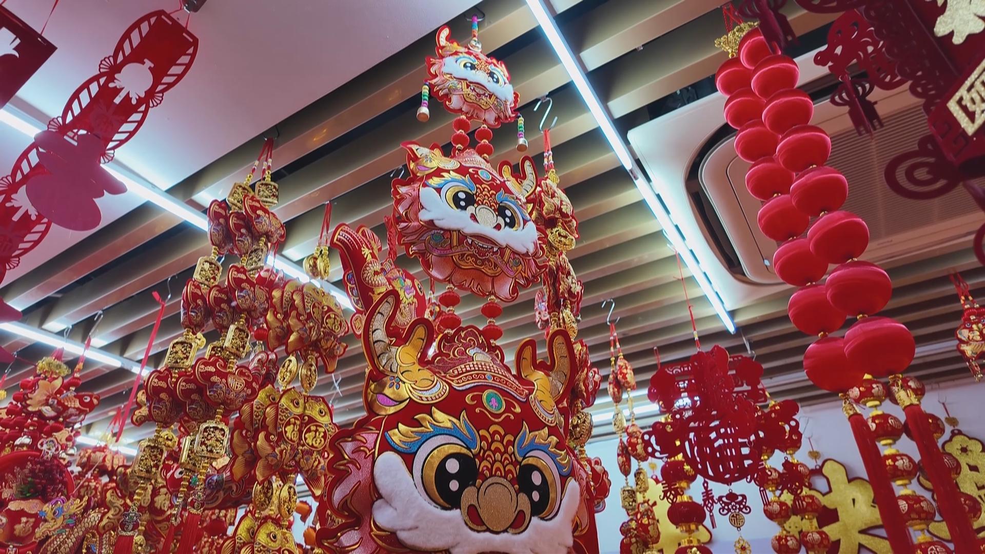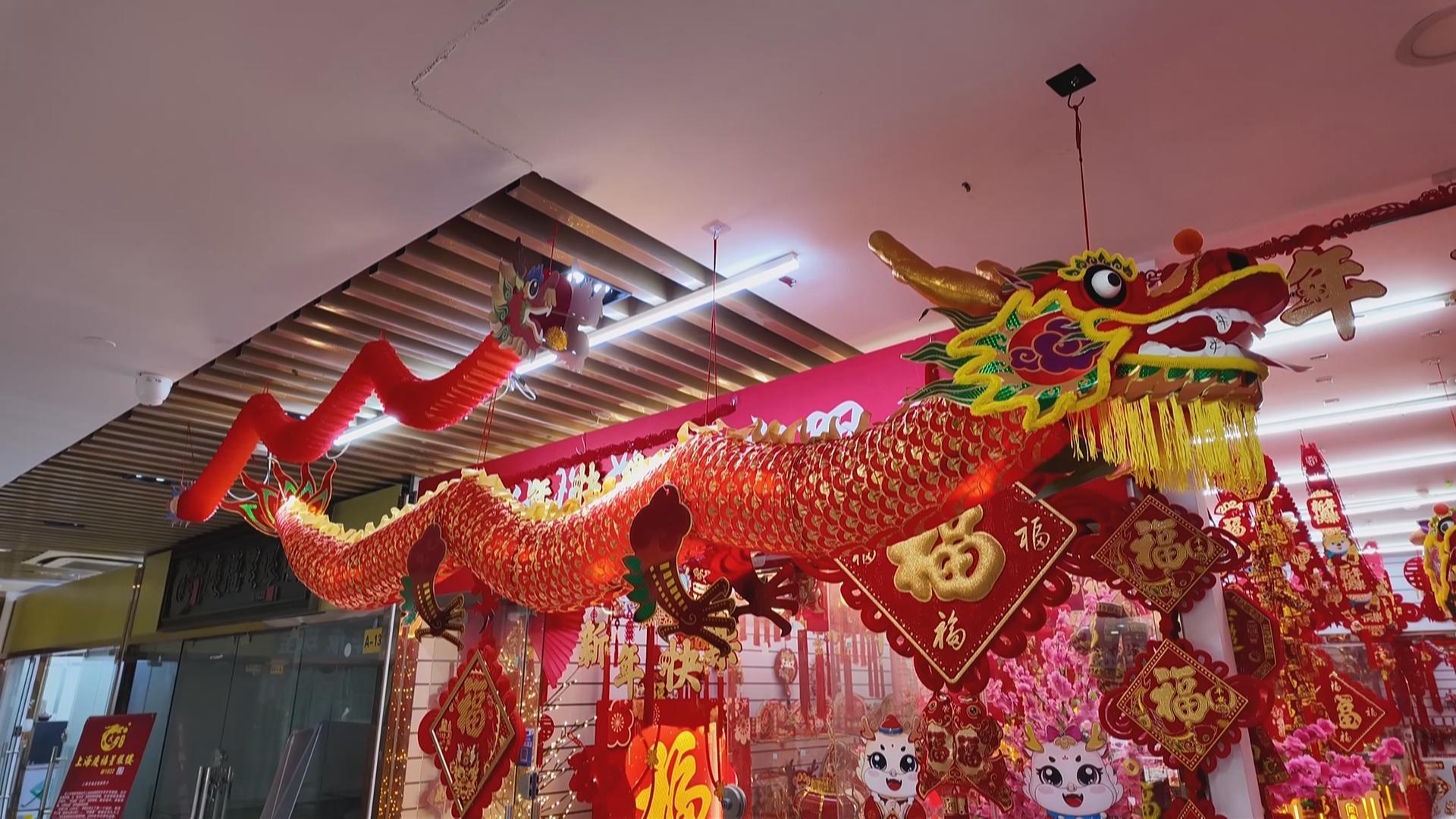 店家介绍,生肖龙和生肖兔一样,都是非常受到大家喜爱的生肖,所以相关的新年装饰也卖得很好,除了传统的福字、挂件、灯笼、红包、春联外,因为龙的体型相对较大,今年的产品中,大型的摆件也占了不少,像这样长条状的龙,还有适合放在大门口的龙年拍照打卡的造型框、扇子造型的墙饰、会下雪的浪漫装置等,都颇受欢迎。“这些龙年玩偶都很可爱,窗花、小灯笼也好看,过年了还是要买些年货把家里布置一下,感觉才有气氛。”一位正在年货市场选购商品的市民说。