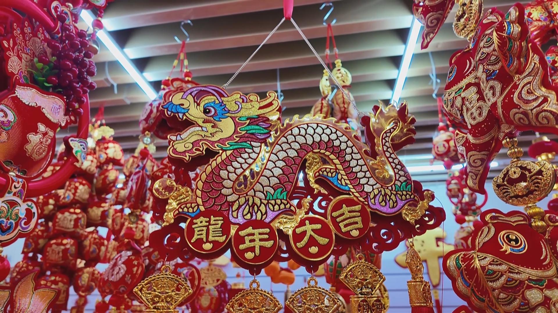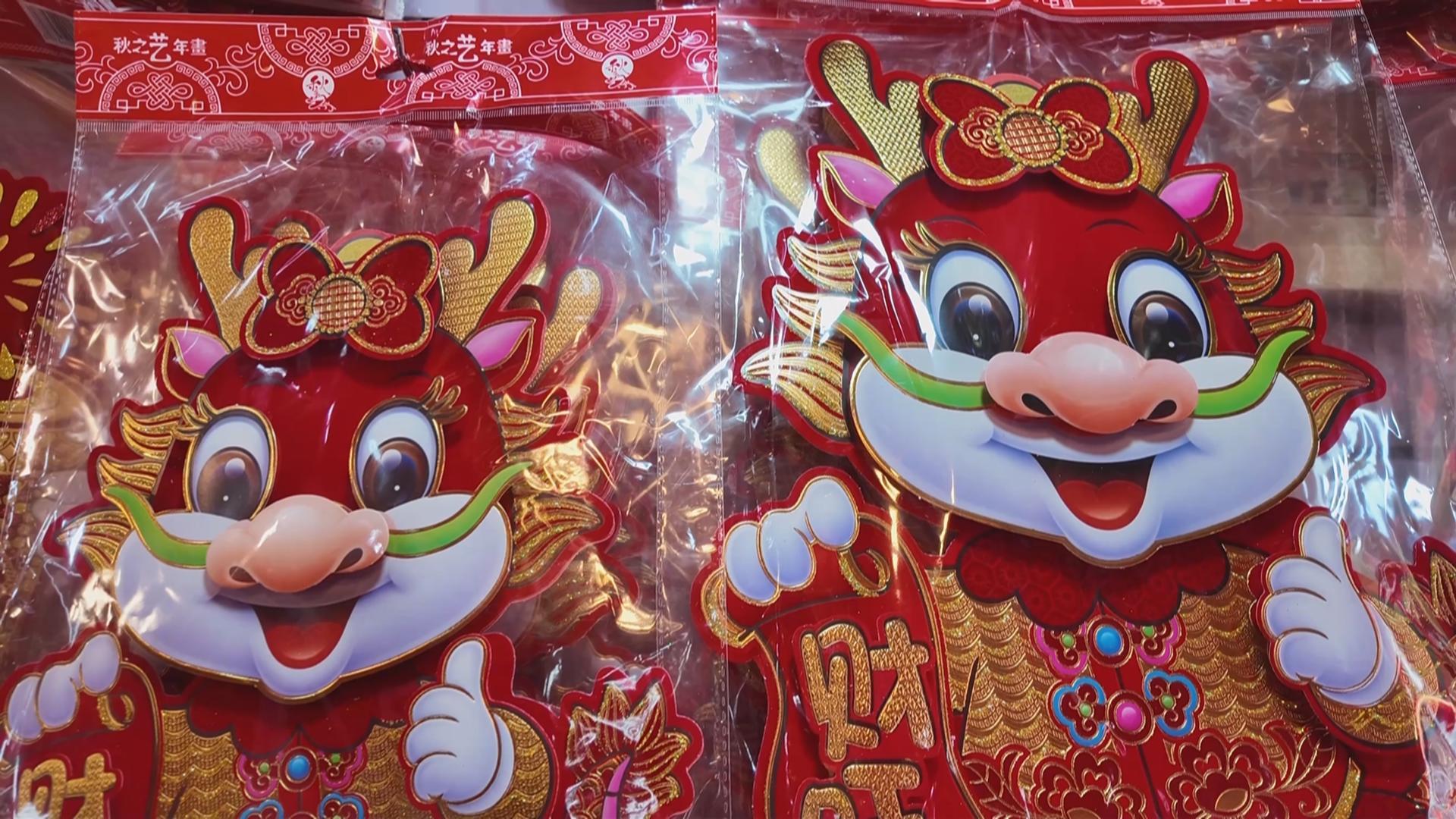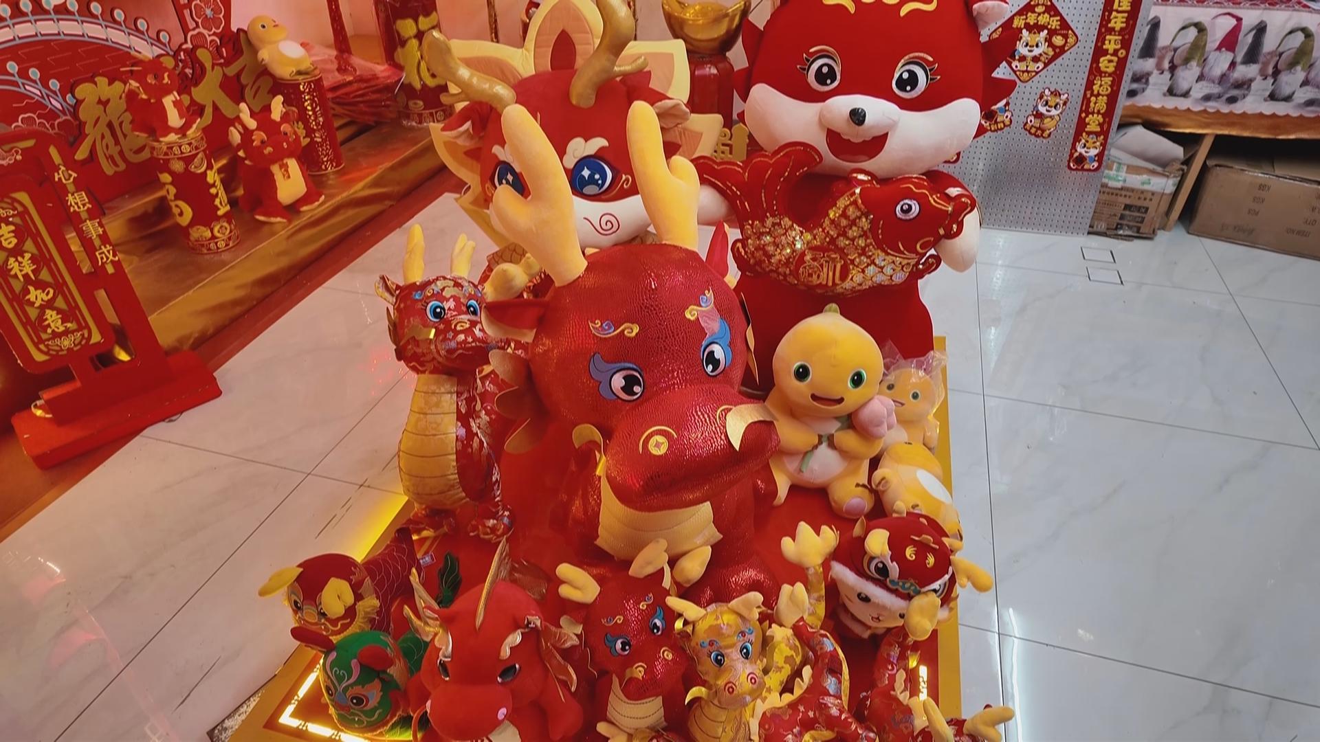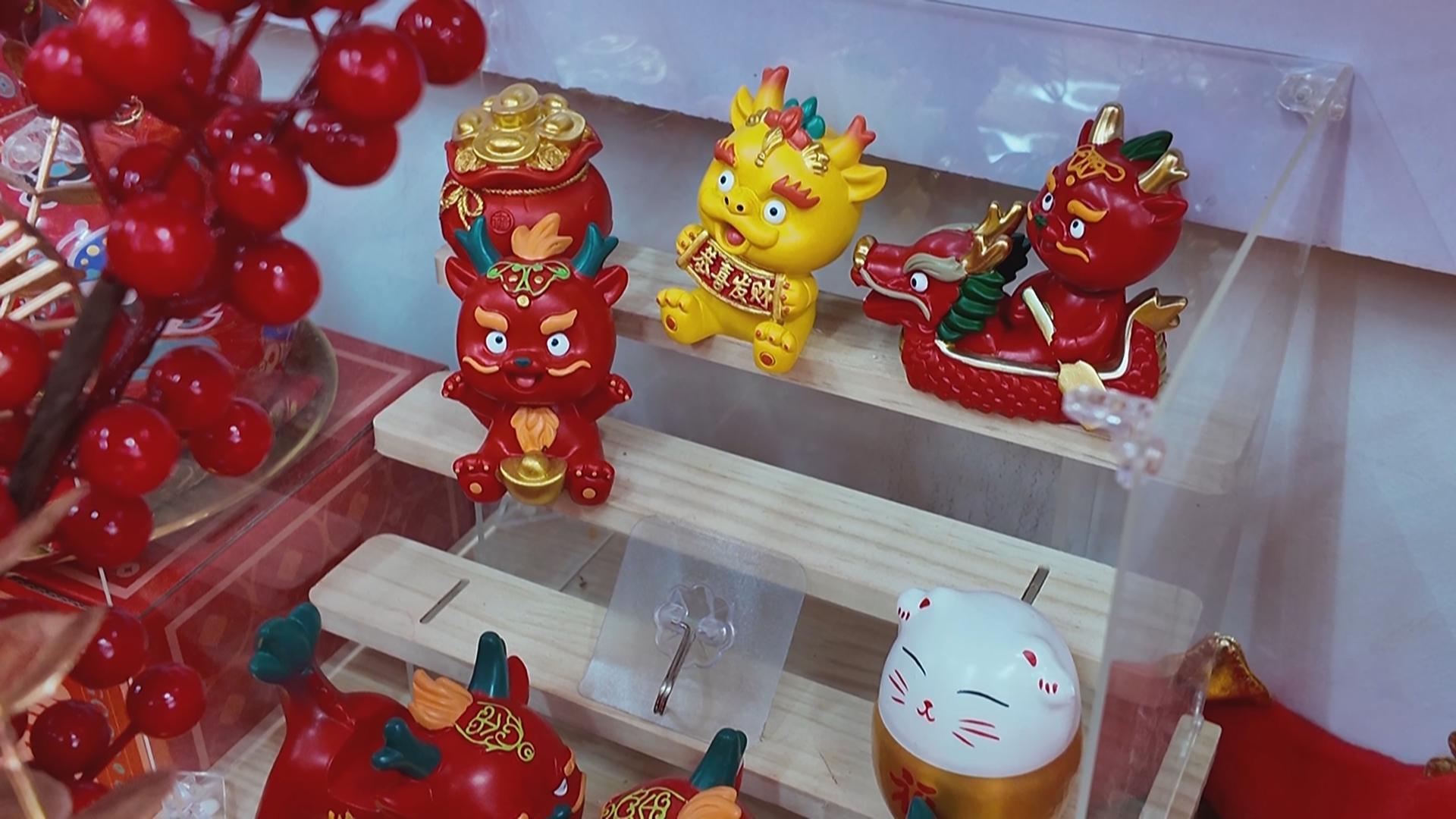 呆萌可爱的龙玩偶、招财纳福的龙年对联、精致独特的龙年窗花、充满年味的新春挂件和灯笼……吸引了不少顾客前来选购。
