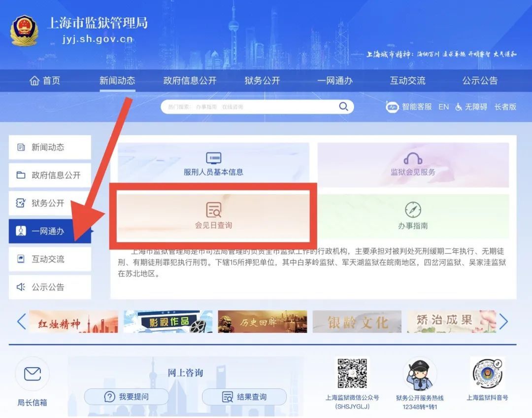 可以访问上海监狱门户网站(https://jyj.sh.gov.cn),首页——一网通办——会见日查询,查询各监狱会见日安排信息。