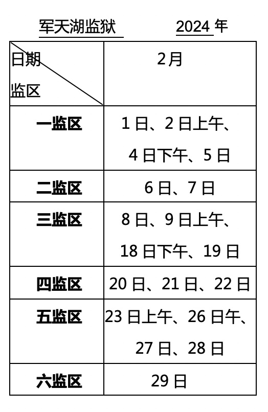 1、军天湖监狱、白茅岭监狱、四岔河监狱、吴家洼监狱所示为集中会见日,如有特殊情况,除节假日、周末外,每周第一个工作日下午至最后一个工作日上午均可会见。