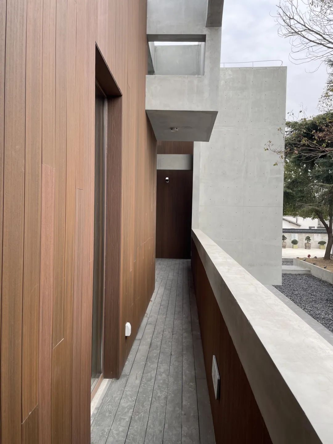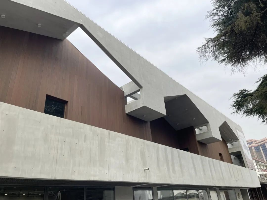 空间外立面及内部墙面以中灰色清水混凝土为主;二层露天阳台顶部铺设木质纹饰,点缀并中和了建筑本身的硬朗线条,勾勒出以清水混凝土为“底座”,以木质板材为“屋顶”的现代主义江南木构的初步印象,具有视觉辨识度。