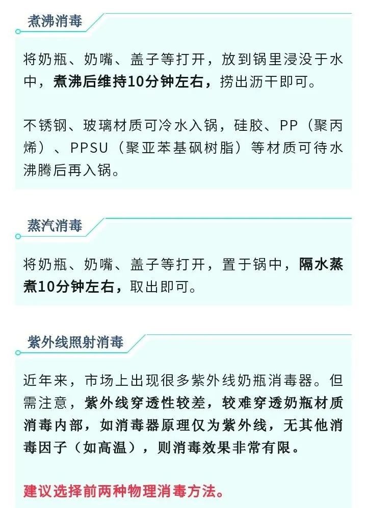 根据奶瓶材质及使用说明书,选择适合的消毒方法。