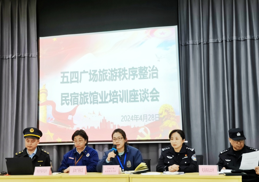 “五一”假期即将来临,为给广大市民和外地游客营造文明有序、整洁亮丽、安全祥和的节日环境。4月28日,青岛市市南区五四广场旅游秩序专班组织开展旅游市场秩序整治培训座谈会,五四广场周边20余家住宿业商户代表参与培训座谈。