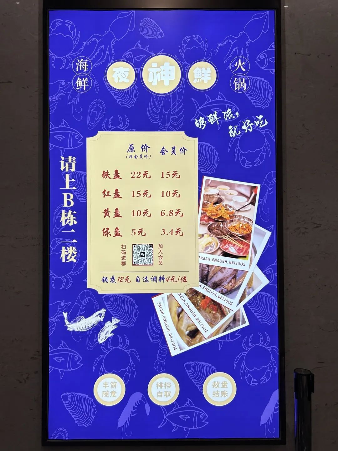 菜品计算方式“简单粗暴”——数盘结账。会员价,铁盘15元,红盘10元,黄盘6.8元,绿盘3.4元。如何成为会员?不玩套路,扫码加老板,进群就是会员,加群就是朋友!