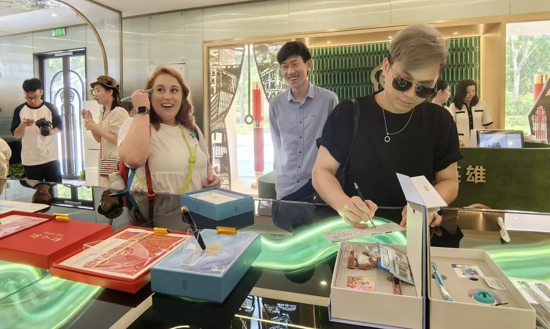 “这支龙年金笔很漂亮,而且我女儿属龙,这非常有纪念意义。”“金色的笔尖看起来更优雅,有一个好的作图工具,能给我更多创作灵感。”“这款钢笔还有按摩功能,我可以一边思考创作一边放松大脑。”在长风湾英雄文创展示馆,中外设计师们对各类新潮钢笔文创产品爱不释手。