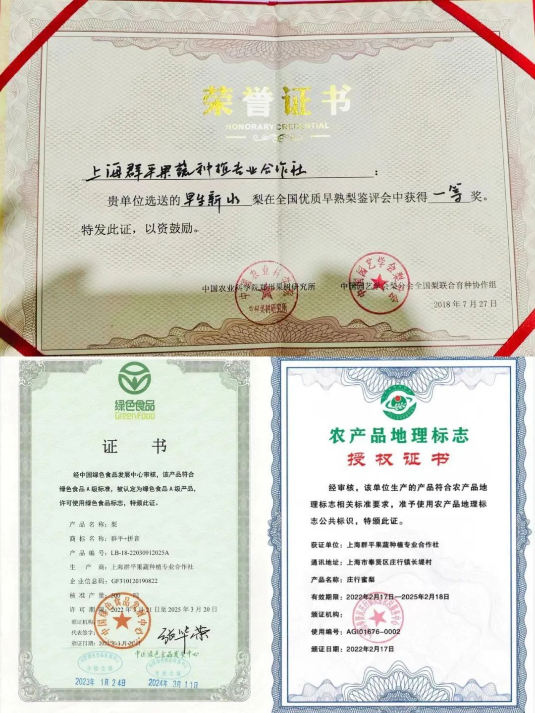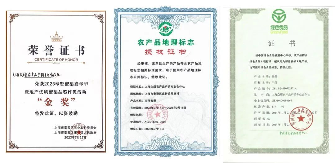 上海众熠农产品产销专业合作社作为专业从事水稻、蜜梨、黄鳝等农产品生态种养的专业合作社,在深耕种养、保证品质的同时,也一直积极探索新的销售模式,通过新型销售渠道,扩大销售面,加强知名度,致力于让庄行蜜梨更好地进入市场。在“2023奉贤蜜梨品鉴评优”活动中获得“金奖”,也是中国绿色食品所认证的“绿色食品A级产品”。