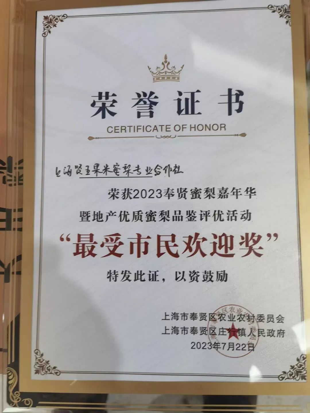 这些累累硕果早已成为贤王果米的宝贵财富,除了不断致力于培育优质果实,贤王果米还积极参与各种评比活动,在“2023奉贤蜜梨品鉴评优”活动中获得“最受市民欢迎奖”。