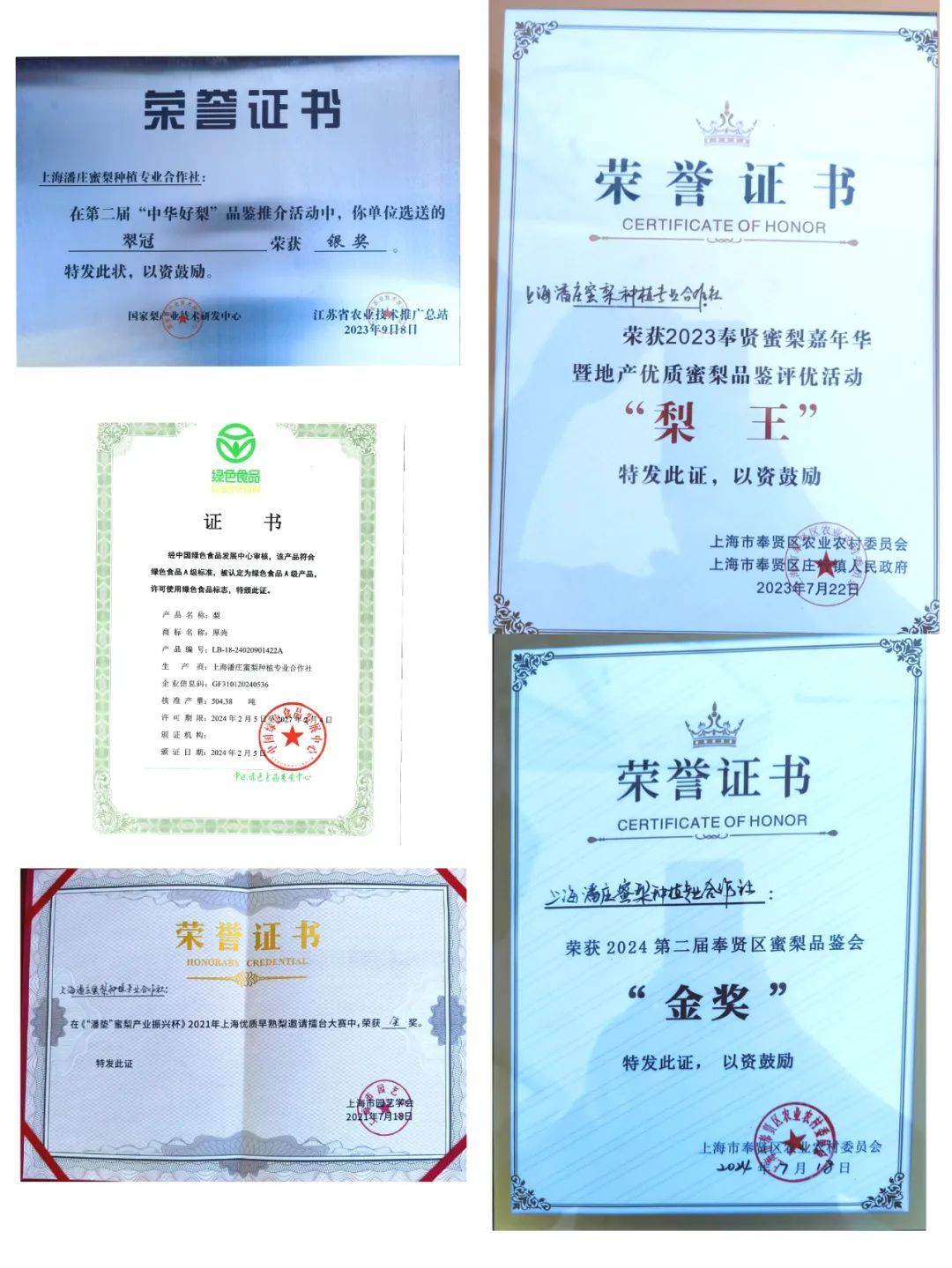 在各种比赛活动中也都可以看到潘庄合作社的身影,在2024第二届奉贤区蜜梨品鉴会上,合作社选送的蜜梨获得“金奖”称号,“2023奉贤蜜梨品鉴评优”活动中也荣获了“梨王”称号,“第二届中华好梨品鉴推介活动”中选送的翠冠获得“银奖”等,这些荣誉都是潘庄合作社努力和实力的证明。