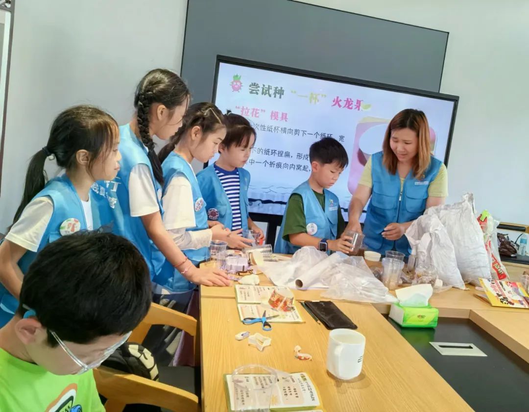 在自然科普教师的鼓励下,“小小园艺师”满怀期待地行动了起来。一次性纸杯成了“拉花”的关键。只见孩子们小心翼翼地将纸杯剪下一圈,轻轻捏扁,形成两个折痕,再将其中一个折痕向内窝起,用订书针固定,心形拉花就完成了。“将火龙果种子种在心形区域内,小心照料,耐心等待出苗就可以了。”三年级学生沈静伊最先解锁“火龙果卡布奇诺”的种植技巧。