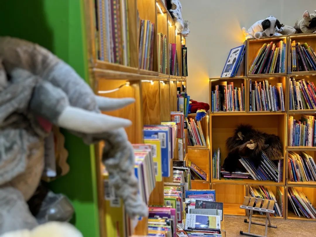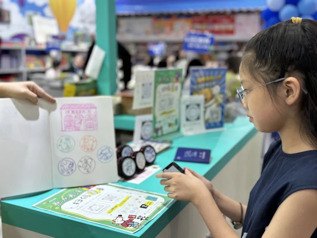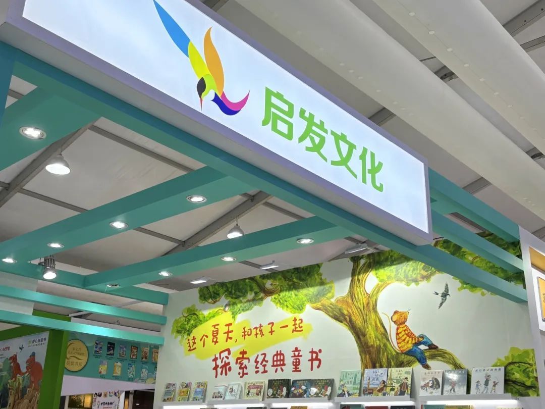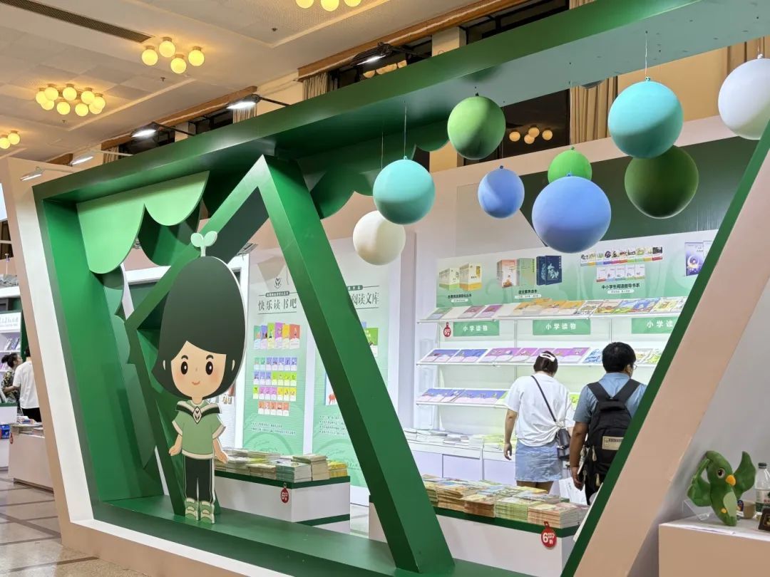 该展台以童趣的画面配合清新的蓝绿色系,营造出勃勃生机与无限活力的氛围。标语“这个夏天,和孩子一起探索经典童书”引人进入读书的殿堂。