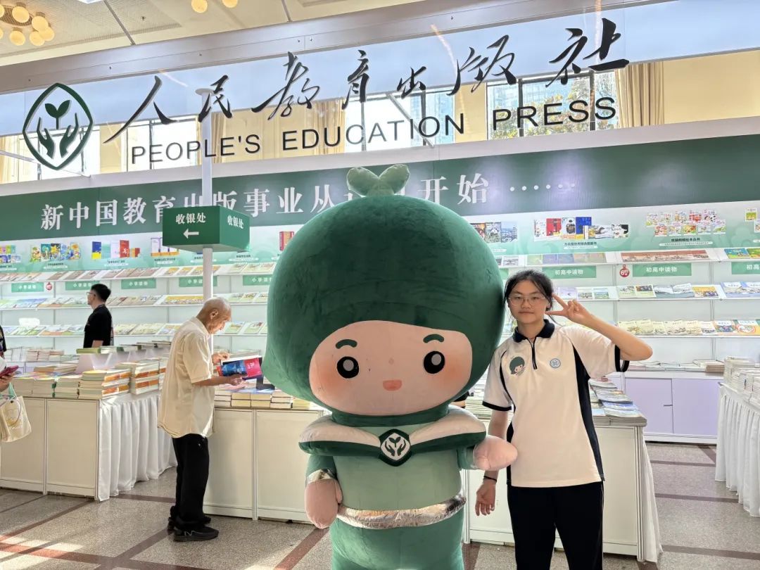 展台以深绿色作为整体色调,配合明亮的展台布置,体现了教育与成长的蓬勃生命力。吉祥物“教小萌”与观众热情互动,增添了无限欢乐。