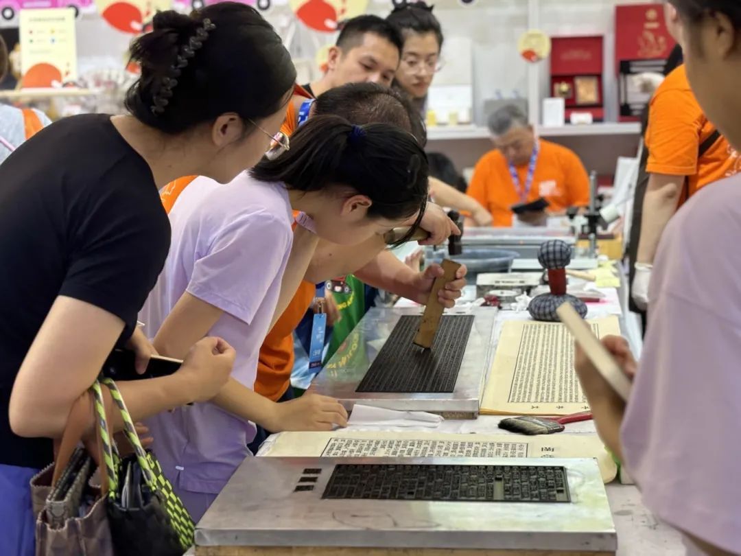 该展台以跃动的明亮色彩为基调,巧妙地勾勒出童趣盎然的氛围。其设置了非遗活字拓印体验区,吸引了众多观众的目光。通过活字拓印这一非遗技艺,参与者们亲手尝试让《兰亭序》《千字文》等经典作品跃然纸上,不仅体验了传统文化的独特魅力,更在墨香与纸张的交融中,感受到了那份古韵之美。