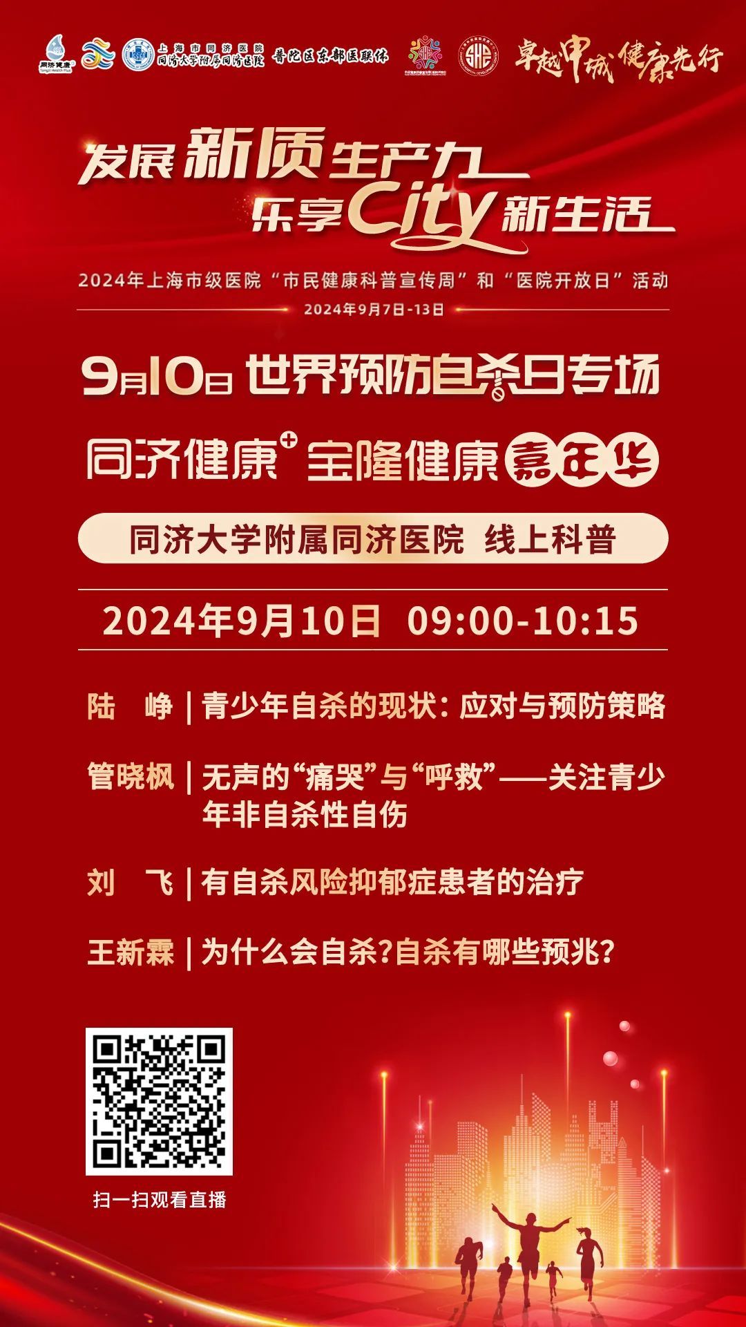 来自精神医学中心的4位专家在2024年9月10日上午9:00正在进行【世界预防自杀日】科普直播,为市民朋友们带来相关科普知识。