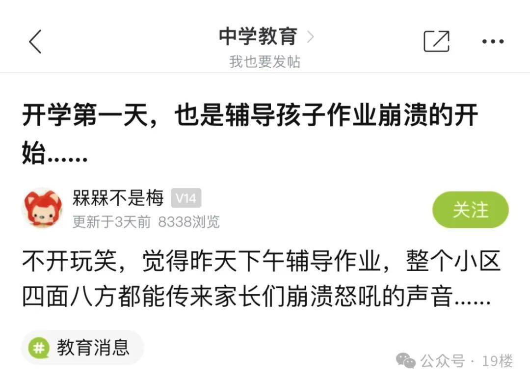 19楼论坛网友@槑槑不是梅发文表示,开学第一天,也是辅导孩子作业崩溃的开始......“不开玩笑,昨天下午辅导作业,整个小区四面八方都能传来家长们崩溃怒吼的声音...... ”