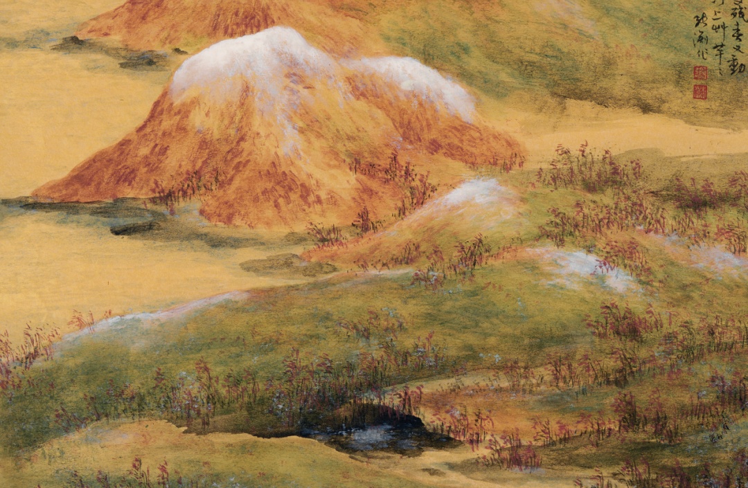 《群嶺残雪》(局部) 在金笺纸上,张渊的每一处精心留白都赋予了画作独特的韵味。无论是双沟染色还是没骨渍水技法,都显得格外引人入胜,为观赏者提供了丰富的遐想空间。金色可以代表天空和山水,也可以象征声音和光芒;它可以是溪流的潺潺声,也可以是草木的芬芳……任彩墨在金笺上流连,借着金笺质地的细腻,或轻柔或大力的笔触,演绎出一幅幅自然清新的画卷。 值得一提的是,即日起至11月16日,参观游览的观众可通过在朋友圈转发展讯,并关注“张渊艺术馆”小红书官方账号,随机点赞3条推文,即可盖印精美的9色套色章《归鸟画夕阳》一幅。 张渊金笺作品展 开放时间:即日起至11月16日,每日10:00—17:00(每逢周一休馆) 展览地址:闵行区七莘路305号二楼张渊艺术馆 注:无需预约,可免费入场观看。 转载请注明来自今日闵行官方微信