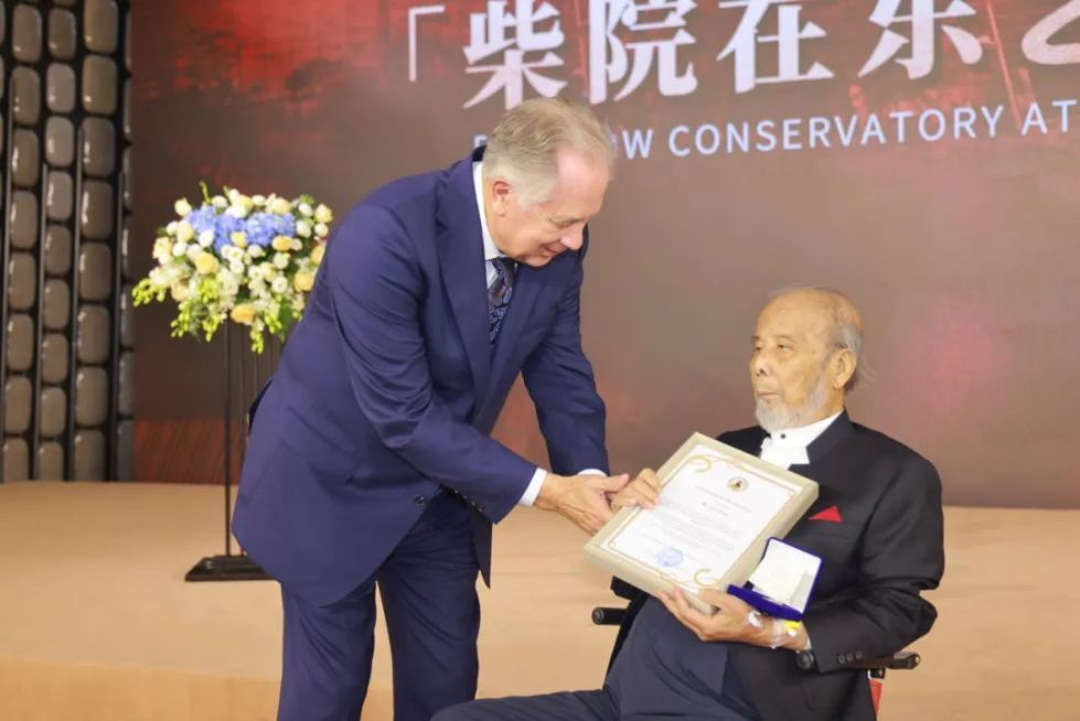 现场柴院校友中,有一位上海市民熟悉的长者,他就是99岁的国家一级指挥曹鹏。原来,正在住院治疗阶段的曹鹏,因本次活动特意前来。尽管曹鹏坐着轮椅,却依旧西装革履、风度翩翩,他神情庄重地接过了由柴院校长亚历山大·索科洛夫颁发的荣誉证书与鲁宾斯坦奖章,并向母校回赠了他在俄罗斯录制的《1812序曲》与《梁祝》唱片。