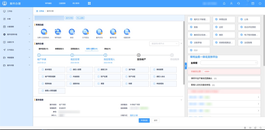 破产案件全流程网上办案系统建设之初,便是着眼于为破产程序参与各方提供便捷高效的司法服务。以“数助办案、数助督导、数助治理”理念为指引,创设法院、管理人、债权人、债务人四大用户角色端口,形成全新的集成办案平台,充分便利各方相关主体参与程序,有效解决了破产案件审理中程序复杂、案卷多、债权人分布各地、时间跨度大等难题。