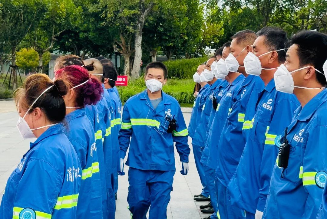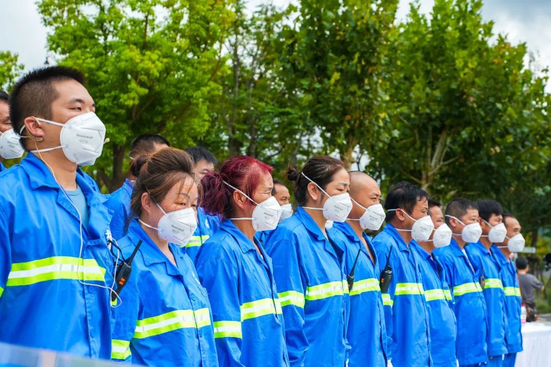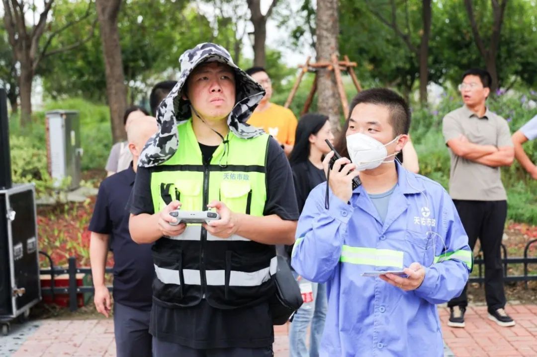 演练队伍由20名应急处置人员组成,应急处置设备由无人机、无人清扫设备及新能源环卫冲洗、清扫设备组成。