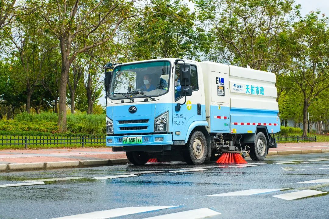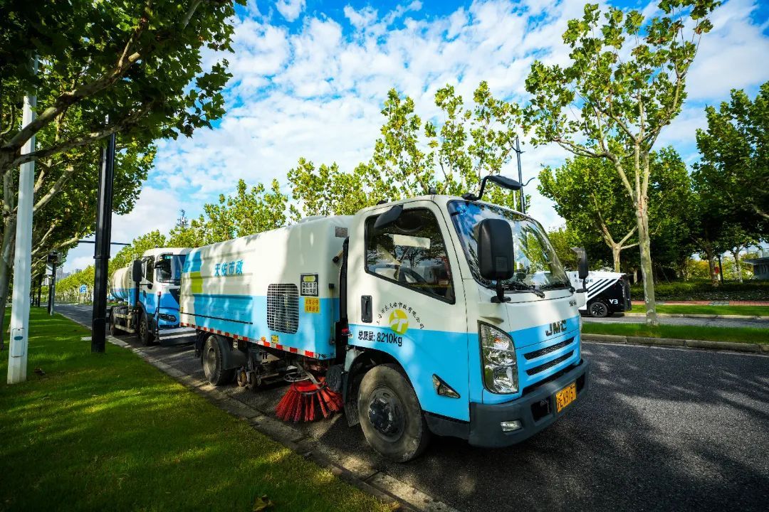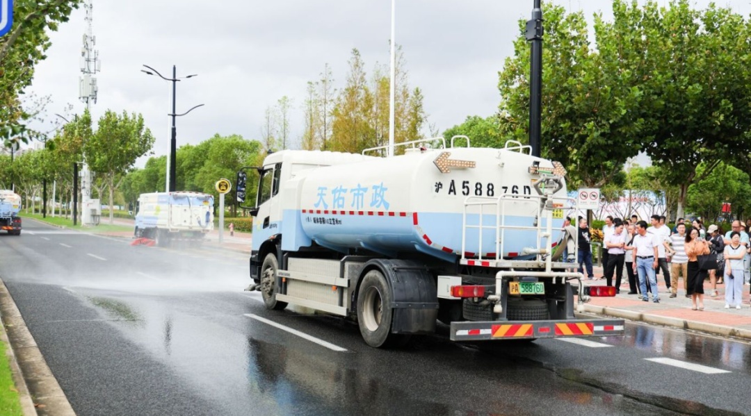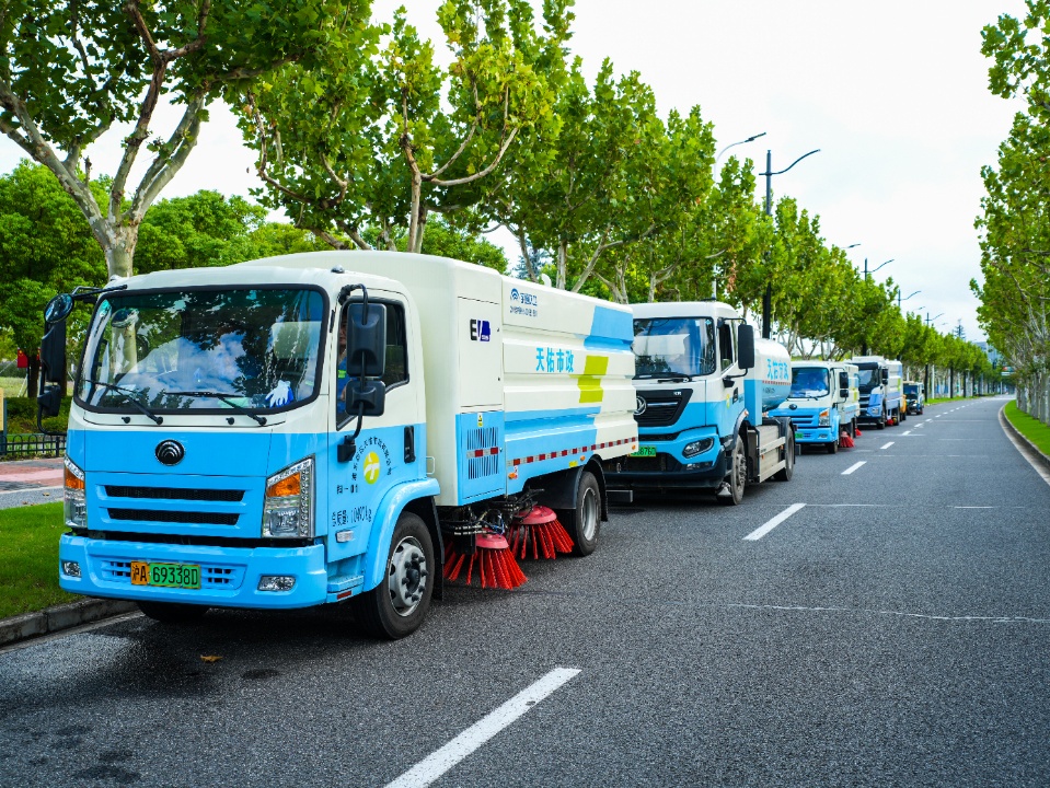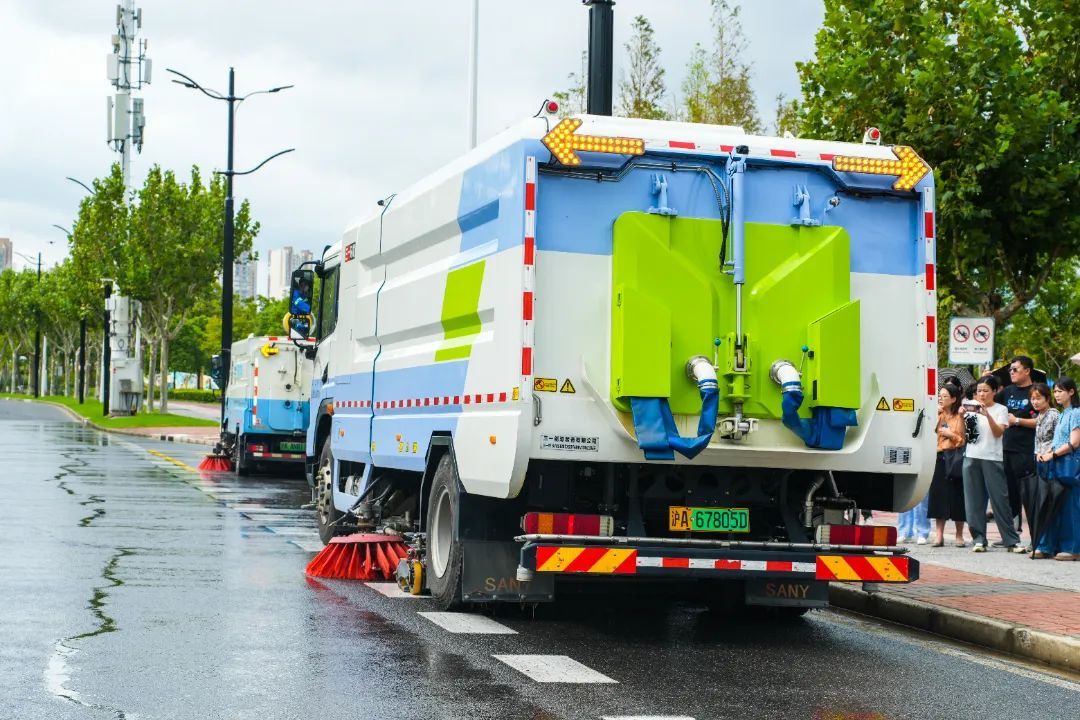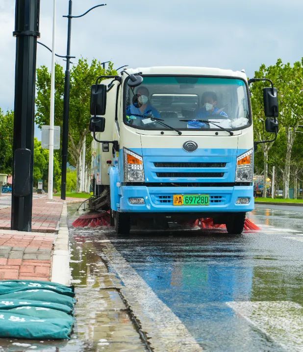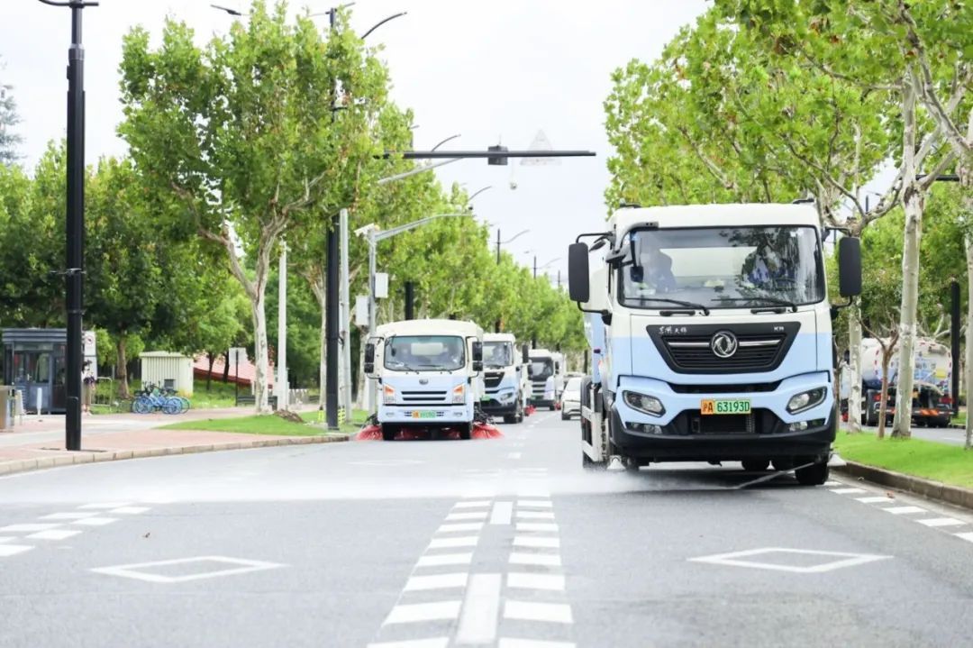 新能源冲洗车、新能源清扫车组团作业实施二次处置。以“冲洗扫喷一体化”作业模式同向同频作业。